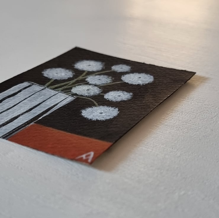 ACEO - A teeny tiny original one of a kind painting of fluffy white dandelions in a stripy vase. This little artwork is painted on textured paper. ACEO's are about the size of an average playing card. They make sweet little collectables, unique gifts, stocking fillers etc and can be framed. Approx overall size - 2.5 x 3.5 inches.