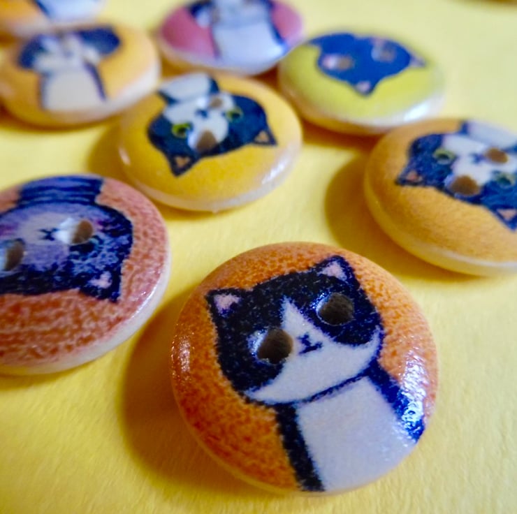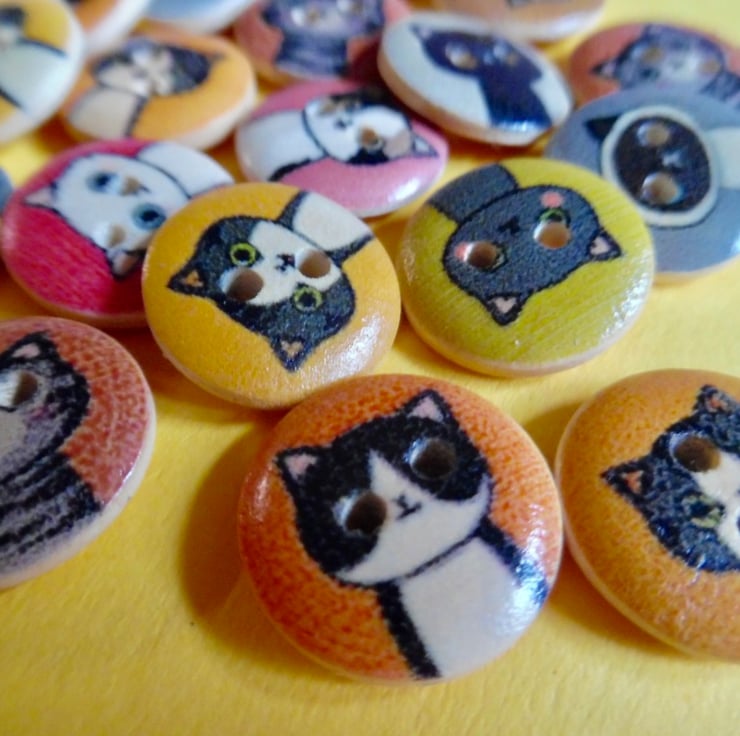 10 x Small Comic Cat Face Wood Patterned Buttons 2 holes 14mm