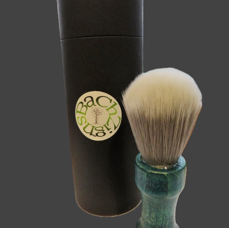 The inspiration for this shave brush has been due to my passion for woodturning and this is my first one available outside our house. The brush complements our shaving stands that we make, we try to pair them up in style or look. Each shaving brush is an individual piece as everything is hand turned on Barbara’s woodturning lathe. These shaving brushes are all different and reflect the individual tastes and needs for something different in life when we all seek something out of the norm. We use vegan friendly finishes on these brushes.