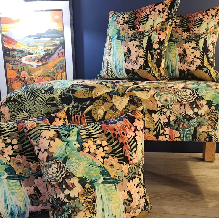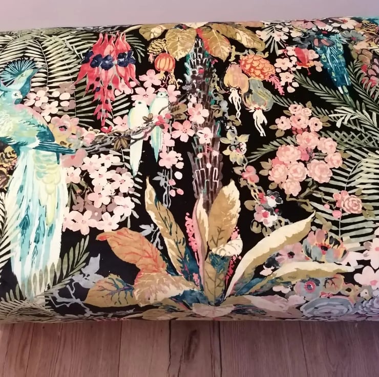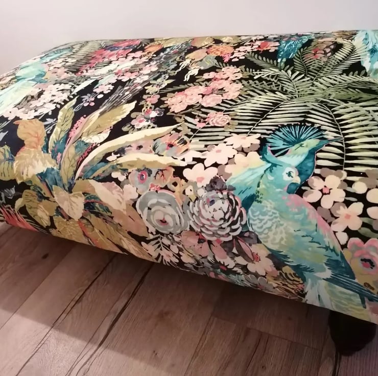 A beautiful Handmade Upholstered Coffee Table, Large Footstool, in Linwood Rainforest Rabble Velvet with optional matching scatter cushions and lampshade with Fire Retardancy SCH3 Interliner material.