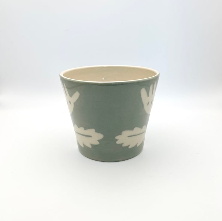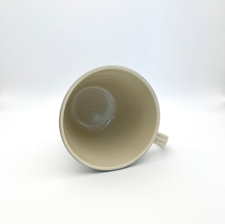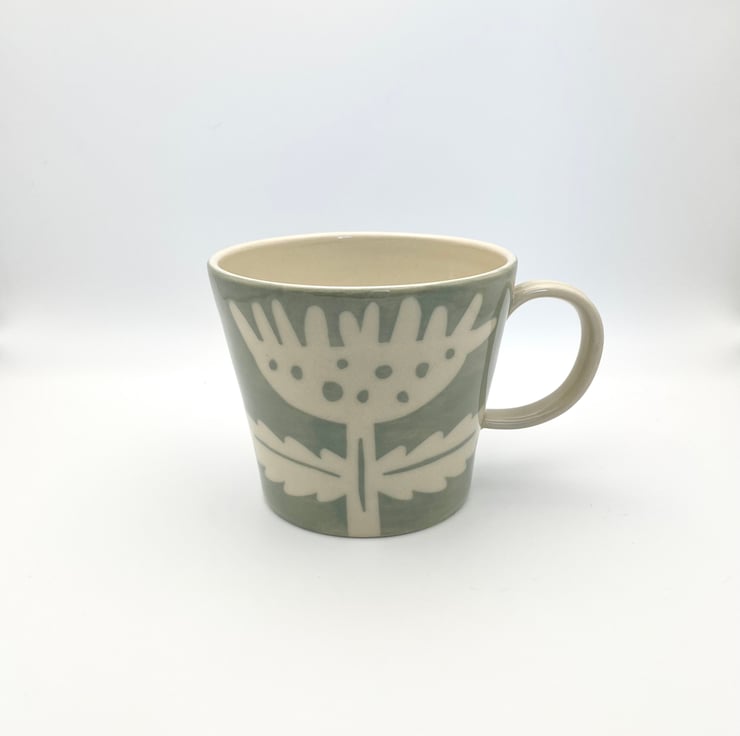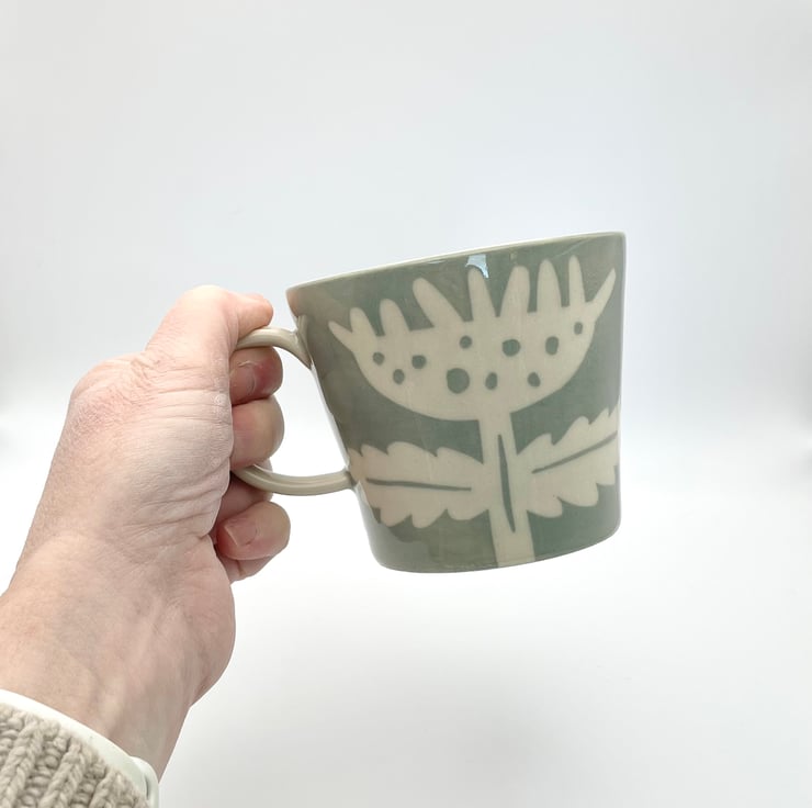 Thrown on my wheel, this pretty stoneware mug incorporates an abstract flower motif over a pretty pale sage green colour.