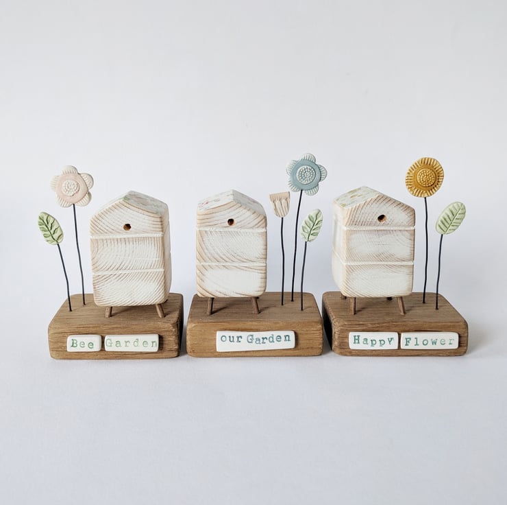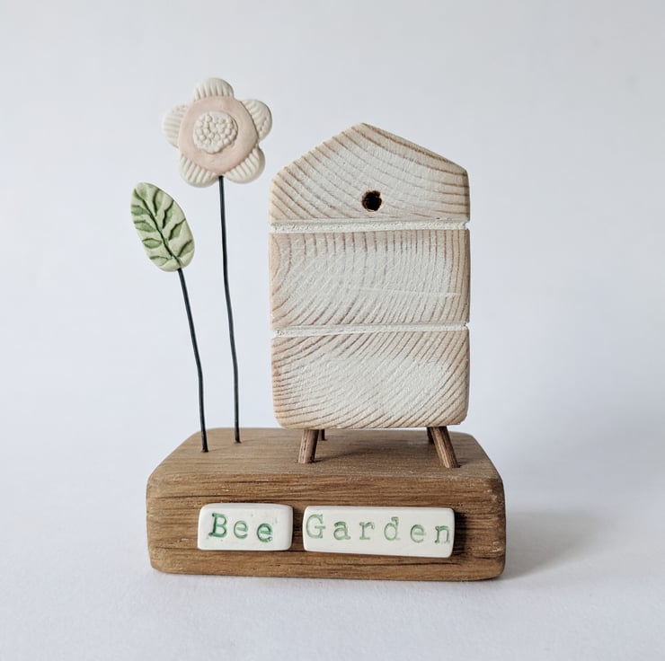 Painted white and sanded smooth it sits on a wooden block with a little flower garden. The sign on the front reads 'Bee Garden'.