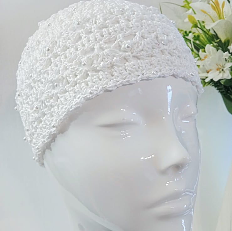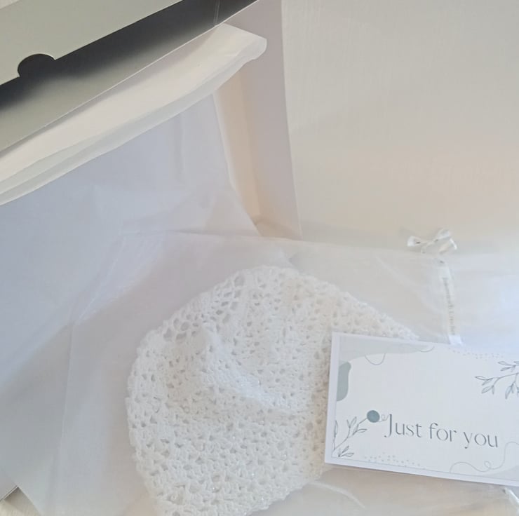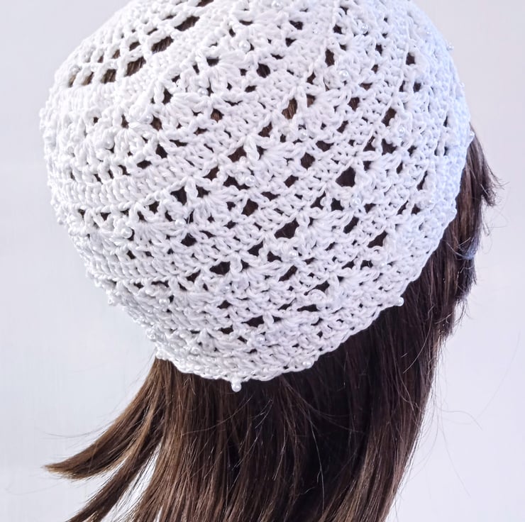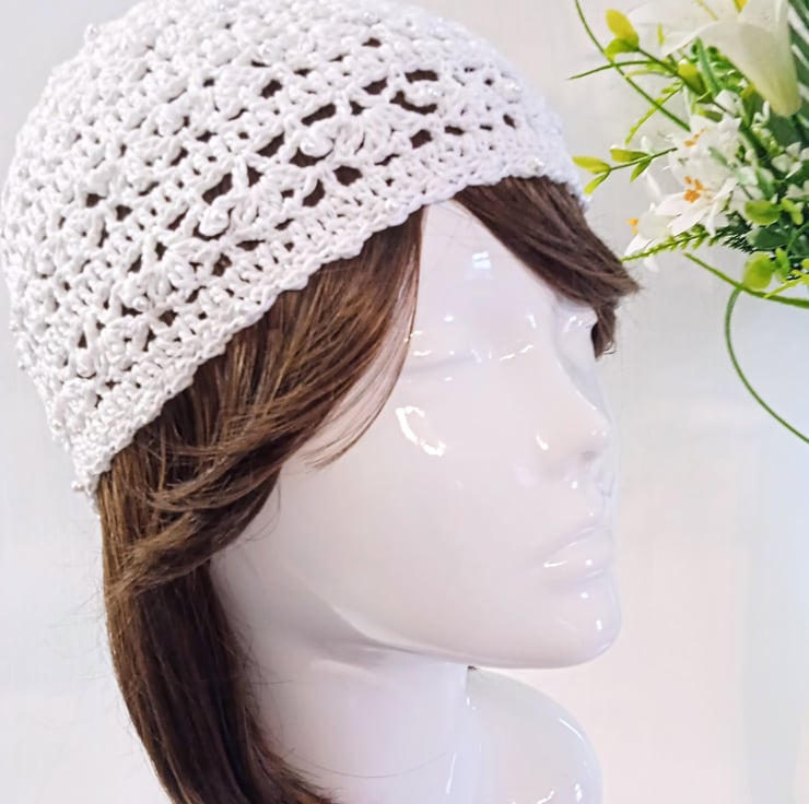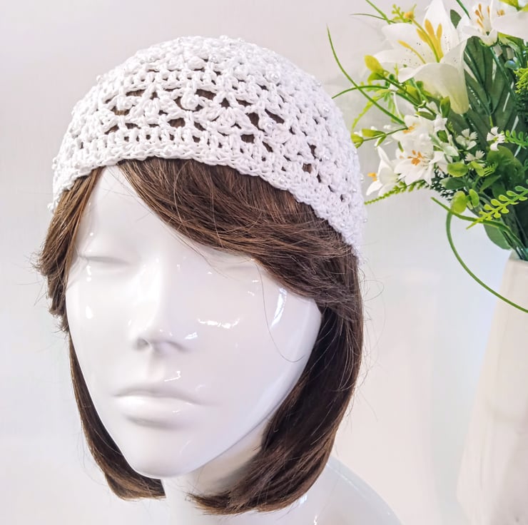 Hand crafted with a high quality, fine mercerised crochet cotton yarn combined with an iridescent white glitter thread, this lacy, white, bride skull cap is perfect for brides looking for a boho chic or 1920s flapper girl feel to their wedding outfit. I can also make this design in other colours for your bridesmaids' outfits.