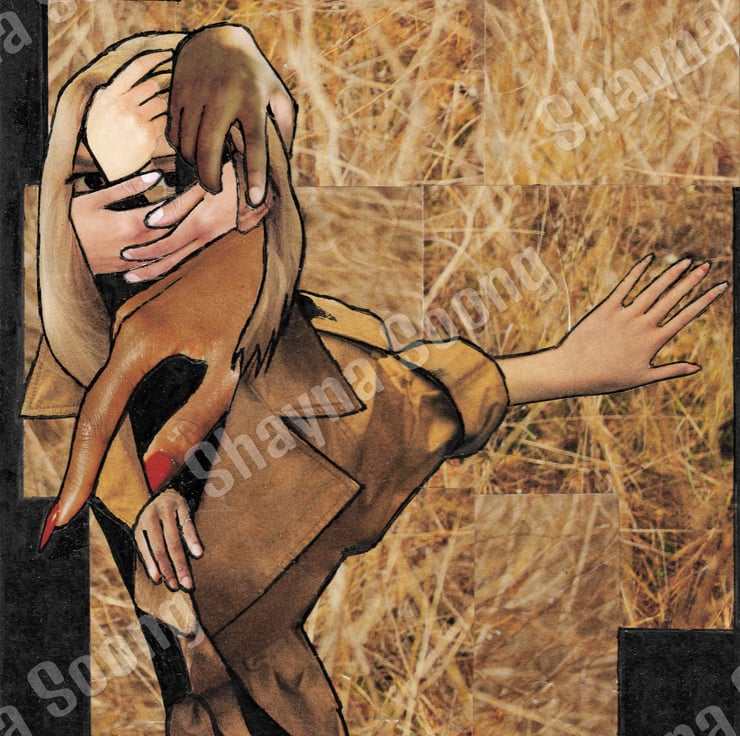 This collage explores the way that female fashion models and celebrities are treated as though they are public property. They exist to be admired, devoured, handled, owned... This one seems to be enjoying the caresses but part of her is seeking to hide.