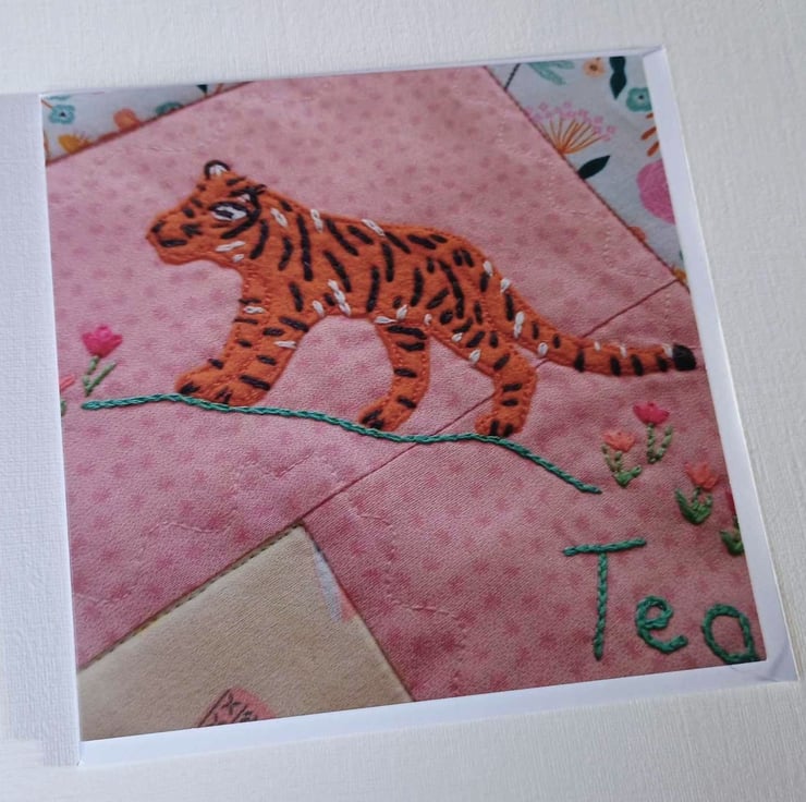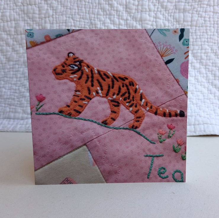 A cute greetings card, professionally printed with an image of my own design hand appliqued and embroidered tiger cub. Blank inside for your own message, and an ideal card for children and the young at heart.
