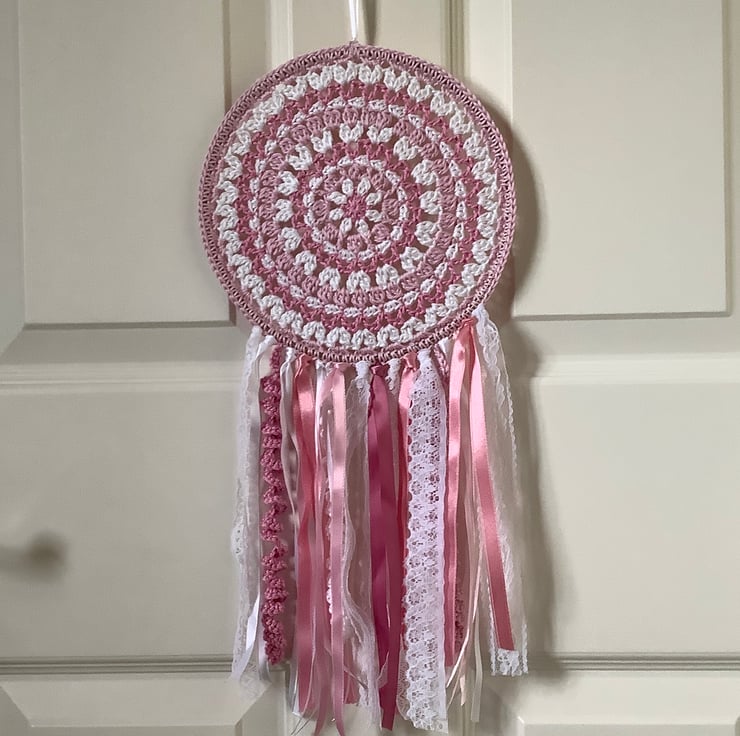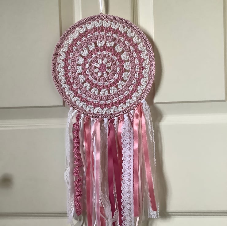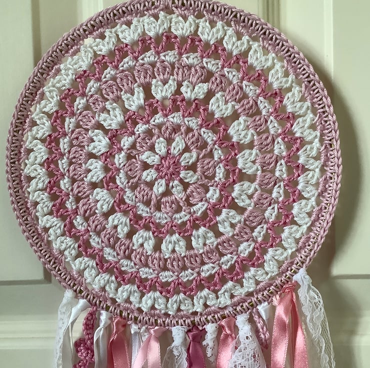 I have made this pretty mandala using a 100% cotton yarn in two shades of pink and white I have then crocheted it to a 20cm (8”) metal ring.