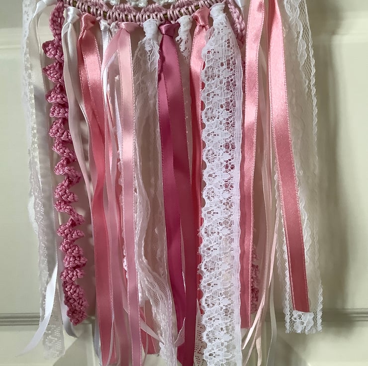 There is a white ribbon loop at the top for hanging and at the bottom I have attached an assortment of pink & white ribbons, white lace and pink crocheted curlicues.