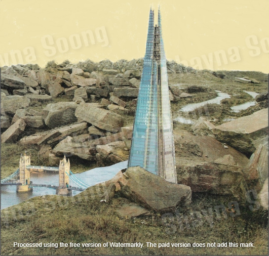 What has happened to London? The Shard, Tower Bridge and the Thames are still visible, but the rest of the city appears to be buried beneath a blanket of volcanic rock.