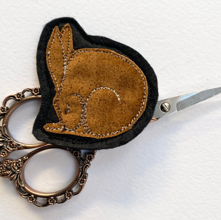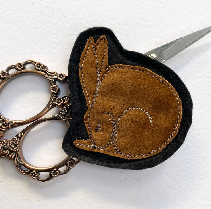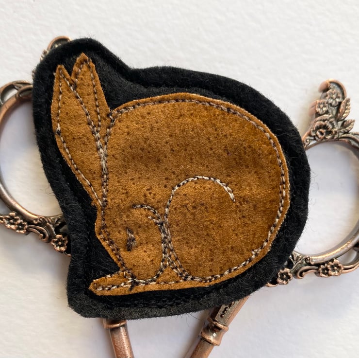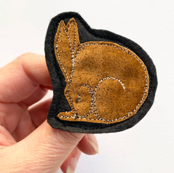 This adorable handmade free motion embroidered sleeping hare brooch is made from up-cycled fabric. It is felt backed, and has a brooch pin with hook on the reverse to keep it nice and secure. It measures 5 x 6cm approx.