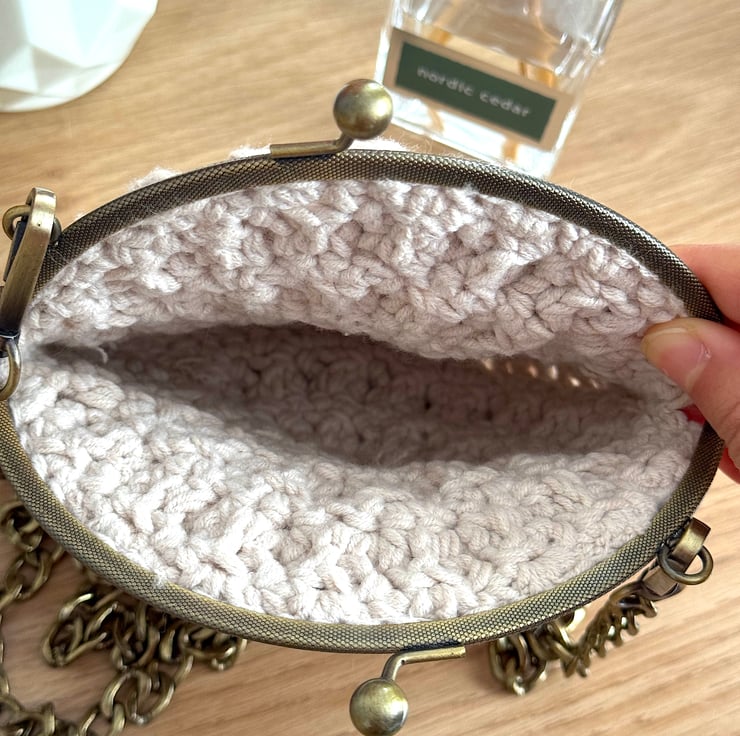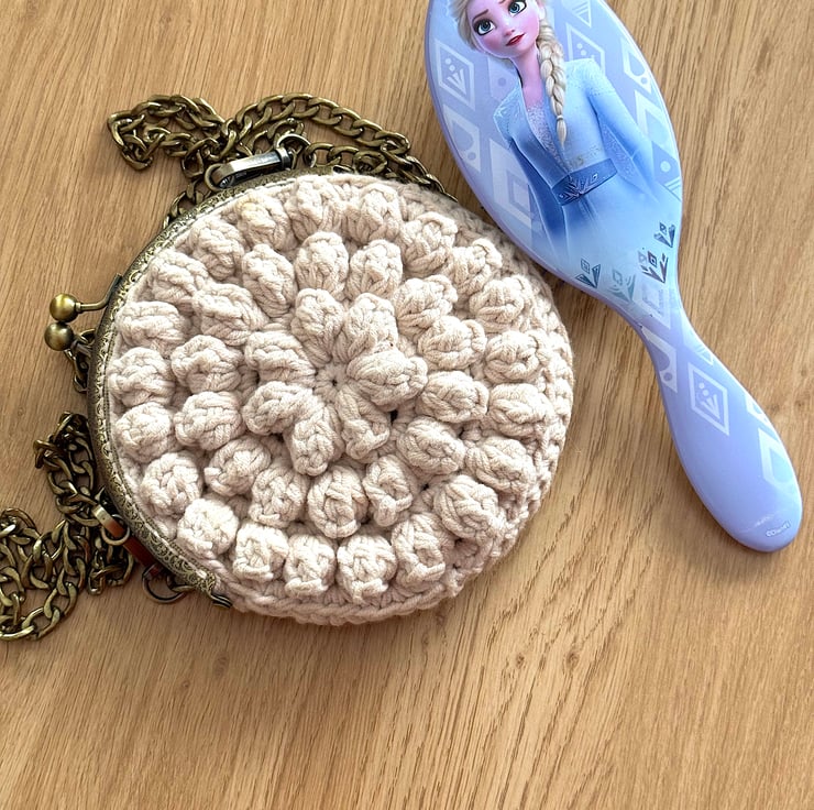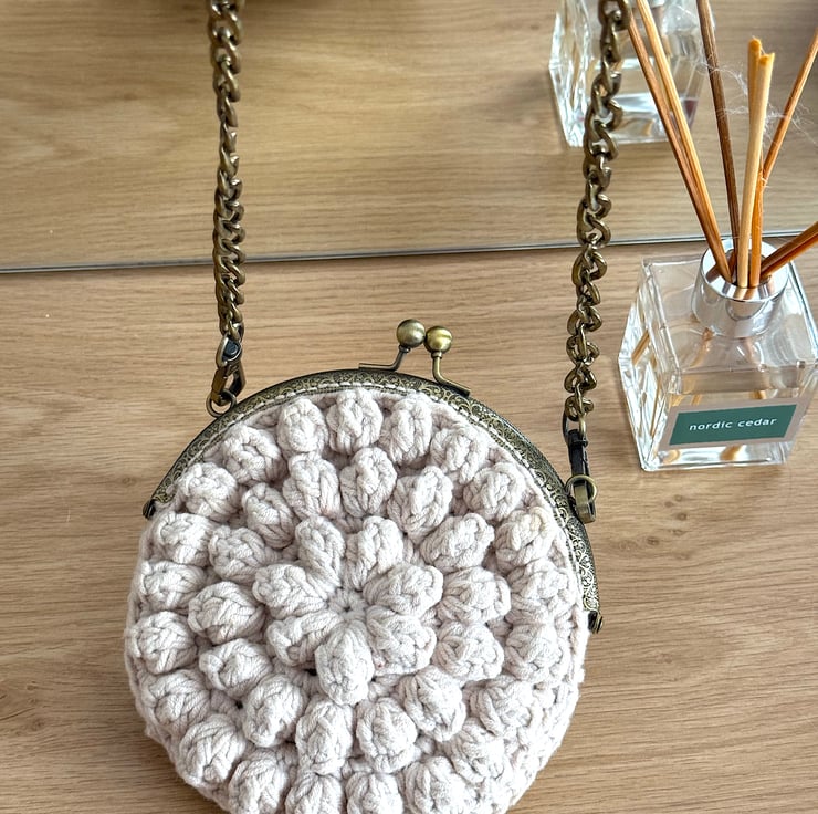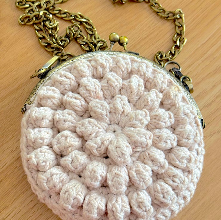 This handmade crochet bag was inspired by the beauty of timeless simplicity and the charm of vintage elegance. The round shape symbolizes wholeness and harmony, while the off-white, greyish hue reflects the calming tones of nature – like soft clouds on a peaceful day. The vintage chain adds a nostalgic touch, reminiscent of treasured heirlooms passed down through generations.