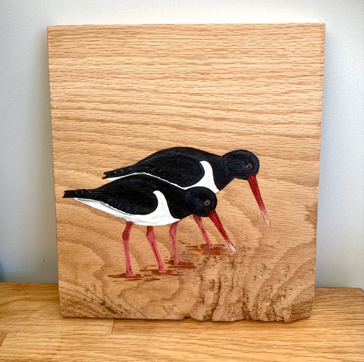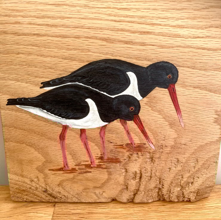I have used the natural grain of this piece of unfinished elm to create this painting of a pair of oyster catchers on the beach.