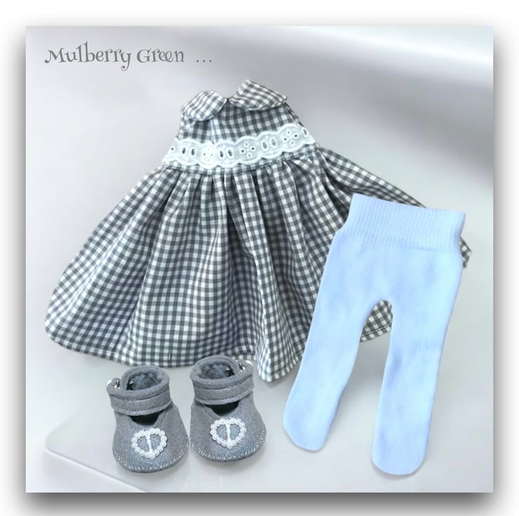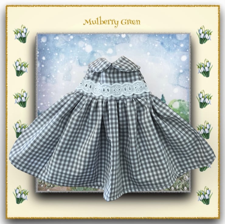 A lovely grey and white gingham dress, with a broderie anglais trimmed bodice, to fit the Mulberry Green dolls. The dress is handmade from best quality cotton, has a lined bodice and fastens at the back with a little popper