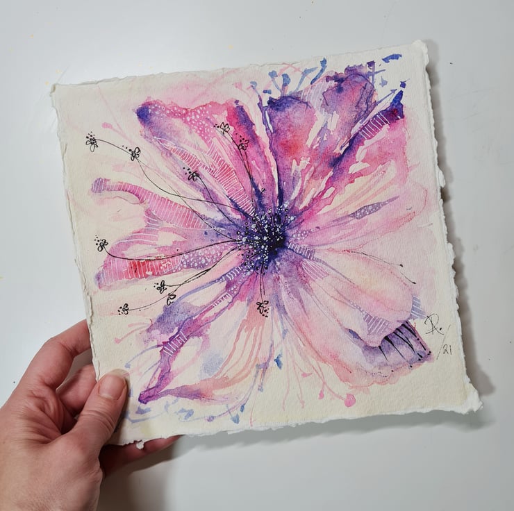 It is one of 3 in a series of abstract flowers painted on Khadi paper.