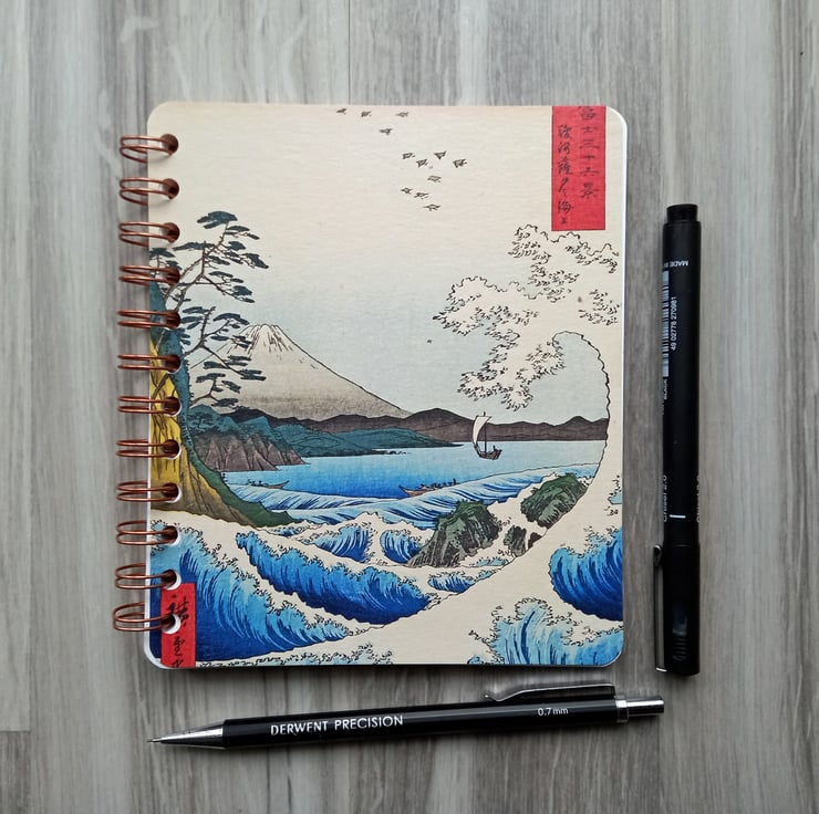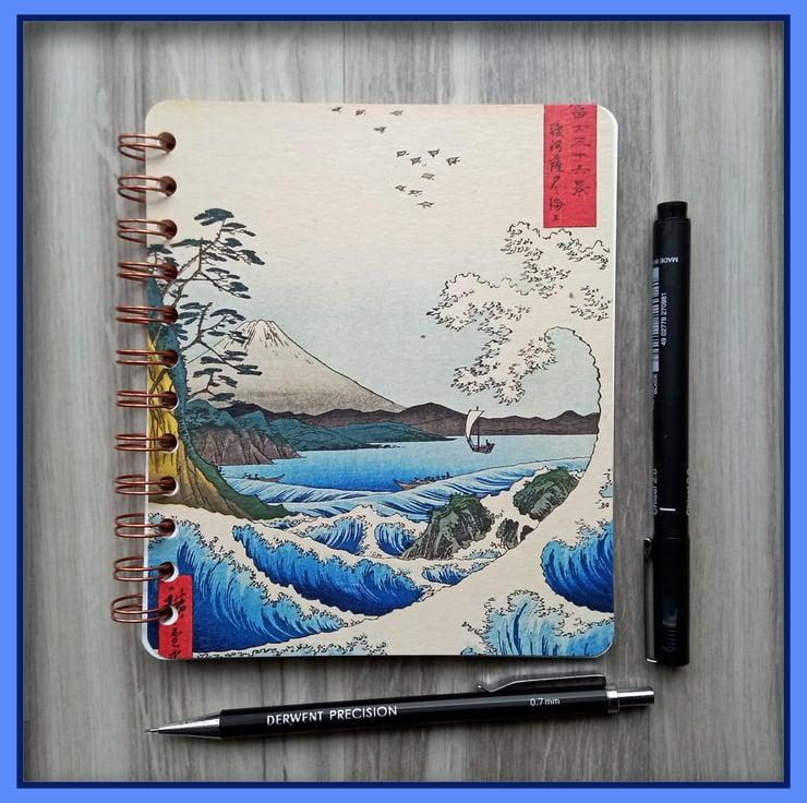 This wire bound notebook/sketchbook is made using a unused greeting card front, the image is of 'The Sea at Satta' from a Japanese woodblock print by Utagawa Hiroshige