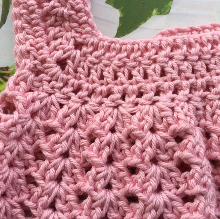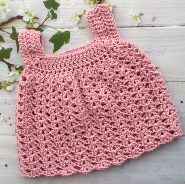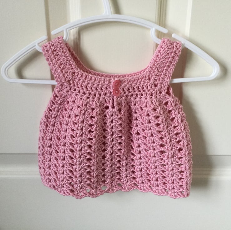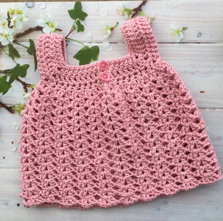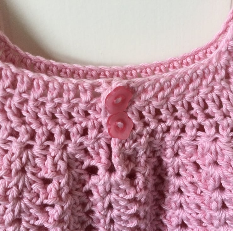 I have crocheted this lovely summer dress in a pink cotton yarn and finished it off with 2 pretty flower buttons.
