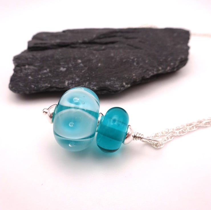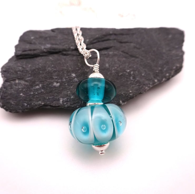 A sterling silver chain featuring a handmade lampwork glass pendant.