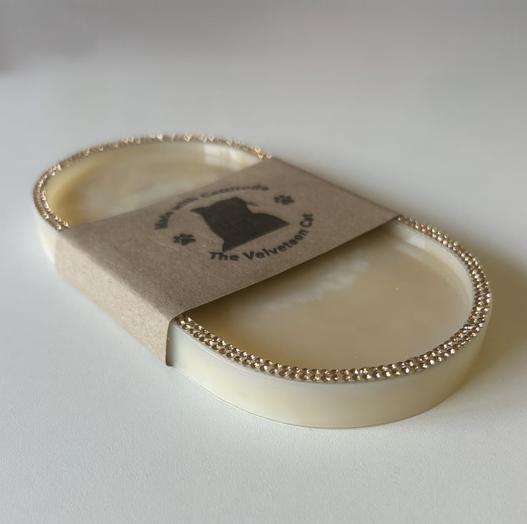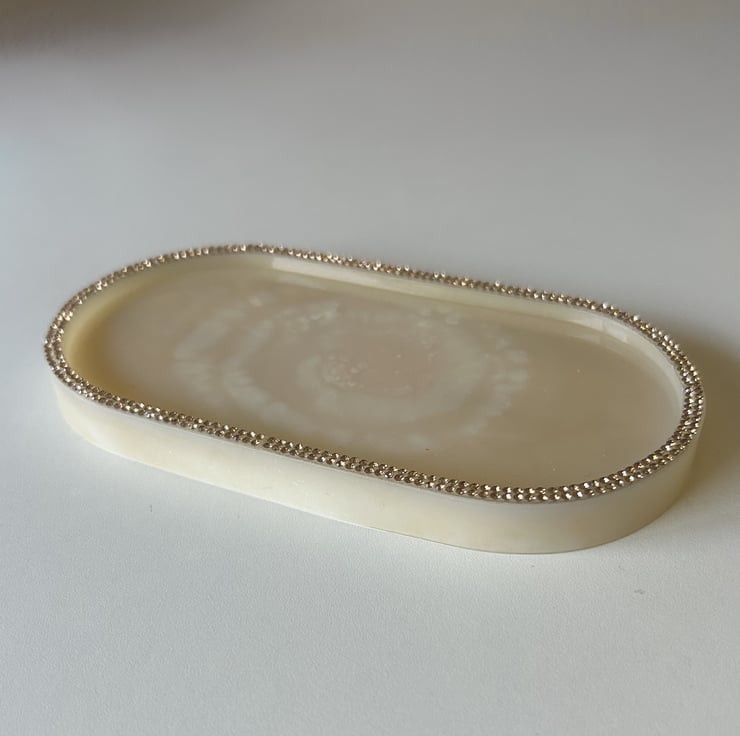 Everything in it's place and a place for everything. This versatile trinket tray made from eco friendly and food safe resin is both functional and versatile providing many different and combined uses. It is perfect for keeping coins, keys, reading glasses, cups, makeup brushes, nail polish or perfume bottles. Or use it in the bathroom as a soap dish or toothpaste rest. In understated hues of subtle shimmering white and muted gold it brings an air of elegance to any environment.
