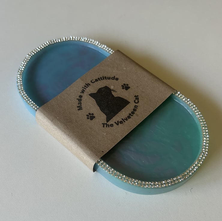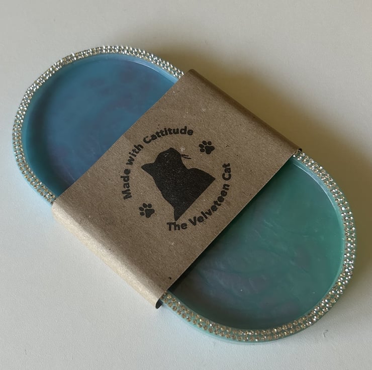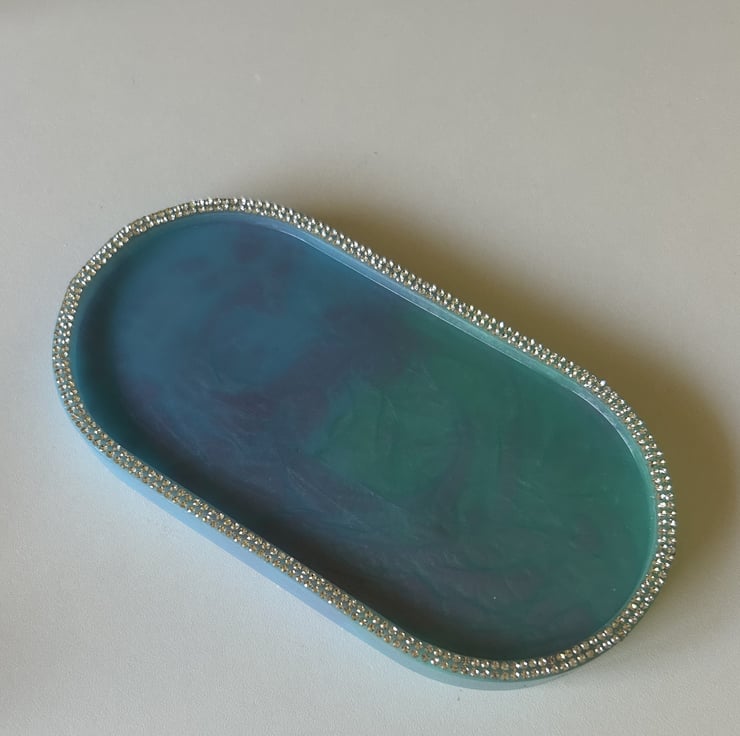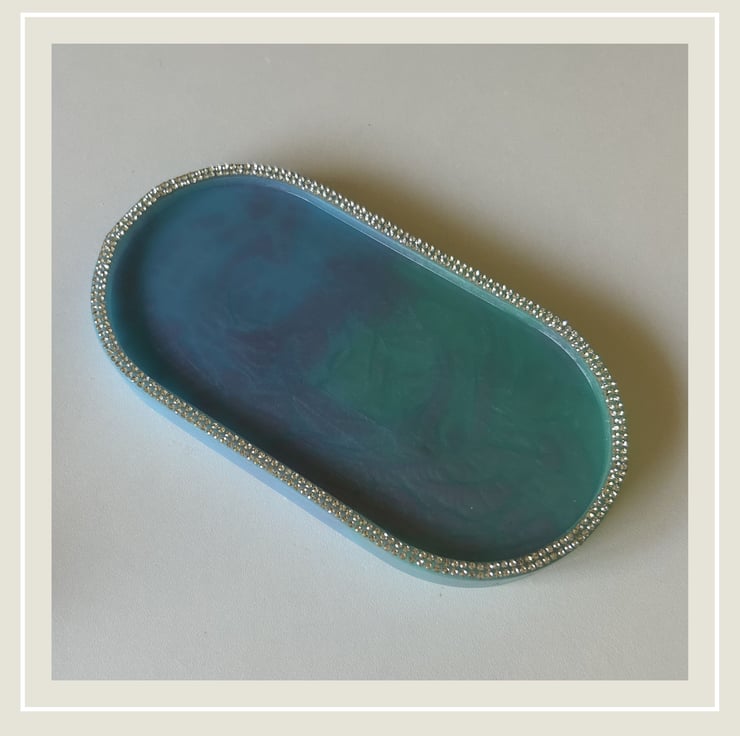 Everything in it's place and a place for everything. This versatile trinket tray made from eco friendly and food safe resin is both functional and versatile providing many different and combined uses. It is perfect for keeping coins, keys, reading glasses, cups, makeup brushes, nail polish or perfume bottles. Or use it in the bathroom as a soap dish or toothpaste rest. In swirling hues of pink blue and green and embellished with silver style rhinestones. It will certainly brighten up any environment.