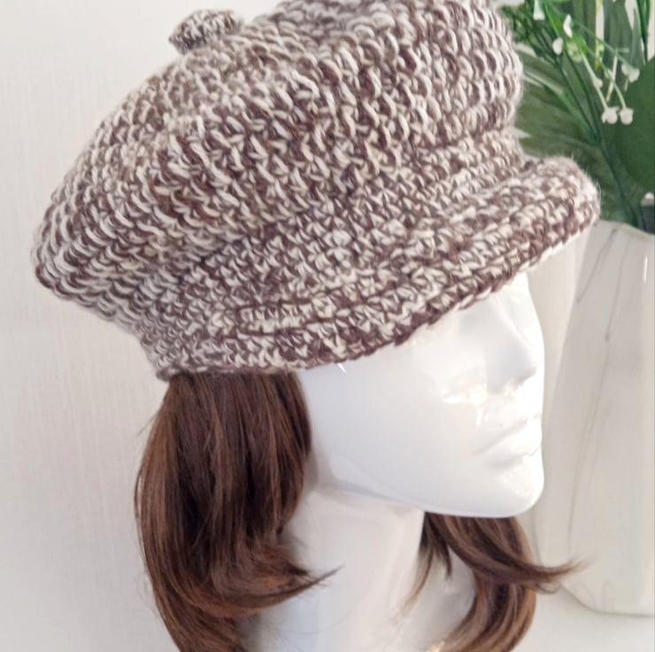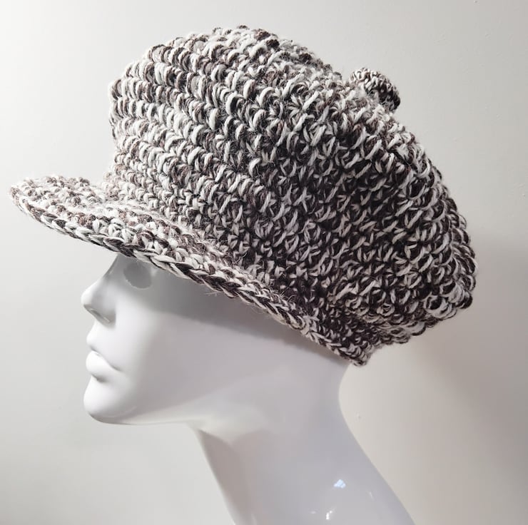 This 1960’s style crochet newsboy hat in brown/cream will give a casual yet stylish finish to your winter wardrobe.