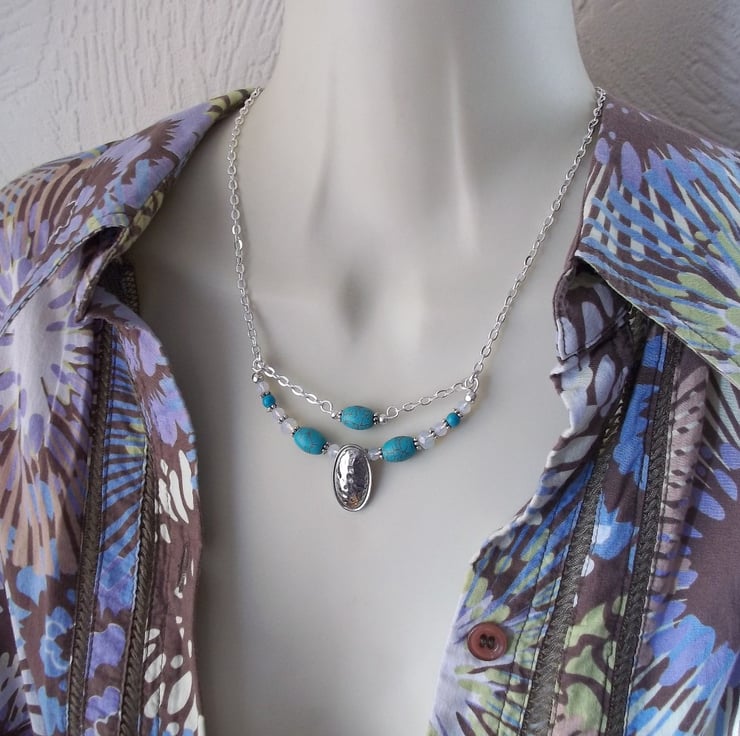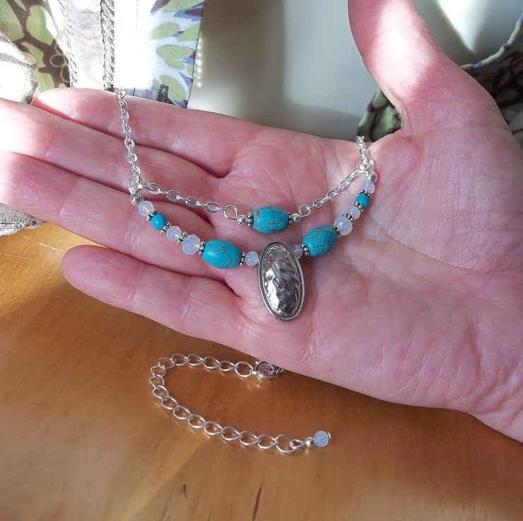 Beautiful layered necklace of Turquoise Howlite & faceted opalite beads. The lower row is a hand curved beaded wire & has a lovely textured hammered effect Tibetan silver oval pendant at its centre and toning daisy wheel spacers while the upper row is a single beaded chain.