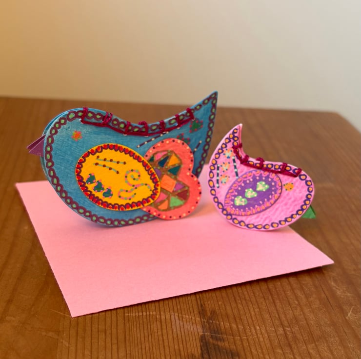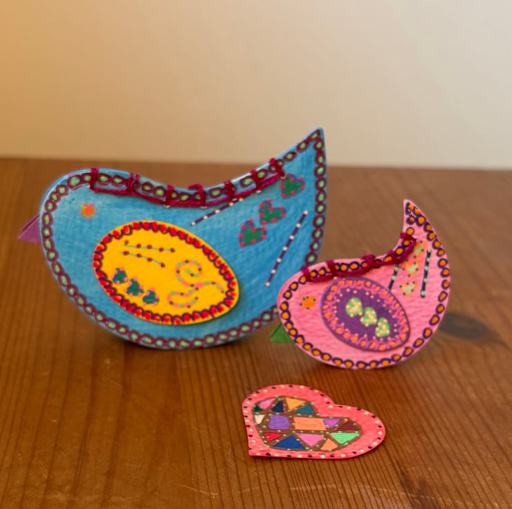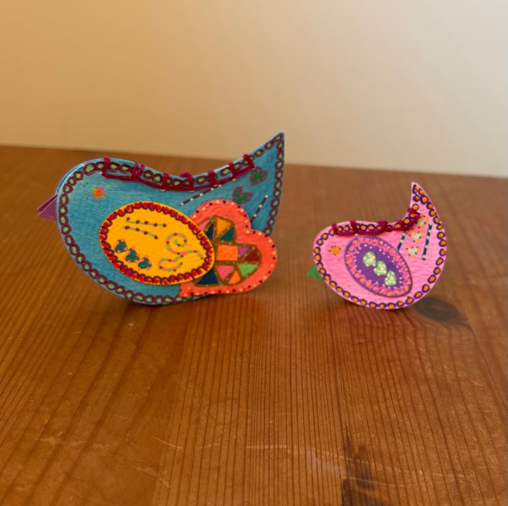 The birds are made from premium watercolour paper hand painted by me in a folk art style. The two motif pieces are stitched together at the top and the birds sit easily on a shelf or table. They rock when the tail is touched.