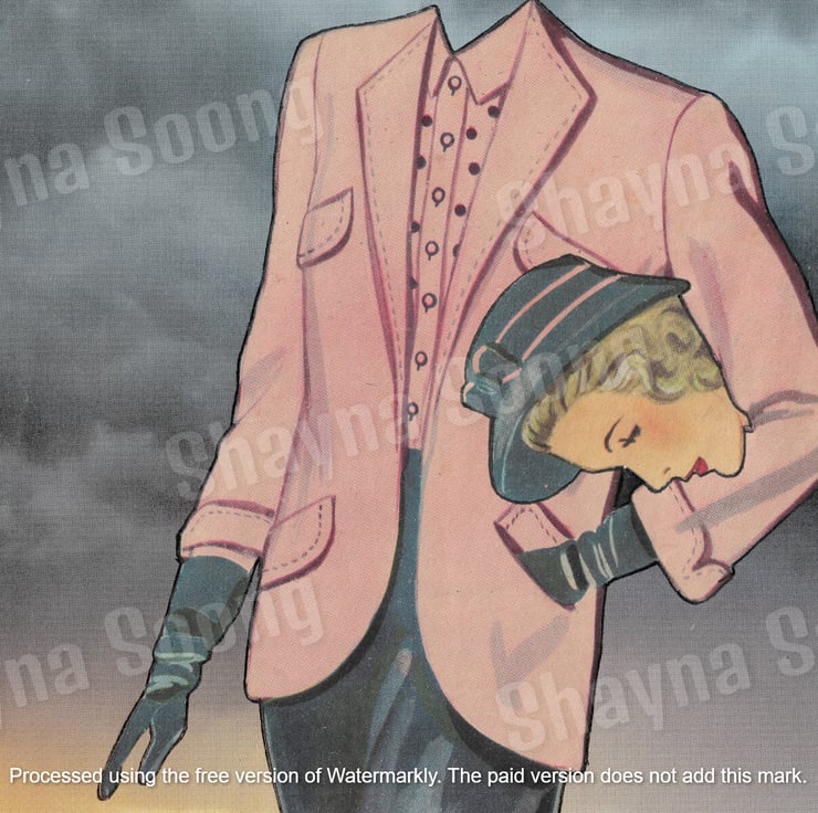 I grew up around sewing. My grandmother and my mother would drag me around fabric shops where I would run my fingers along the rolls of material and listen to them droning on about the merits of each one and its suitability for particular garments, smelling the stuffy air and longing for the cake that would follow. I loved watching the long wooden ruler that would be used to measure out the fabrics. My mother sewed a lot of my clothes when I was a kid. I watched her work on her noisy Pfaff, subliminally learning the craft without ever putting this skill to the test myself. This image is a surreal, darkly humorous take on the stilted models depicted in vintage sewing catalogues. I transformed the prim and proper lady into a horrific ghost, carrying her own head. Somehow, the effect is muted and the figure is not menacing. I'd sit and have cake with her, would you?