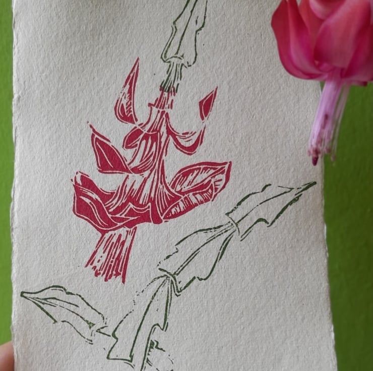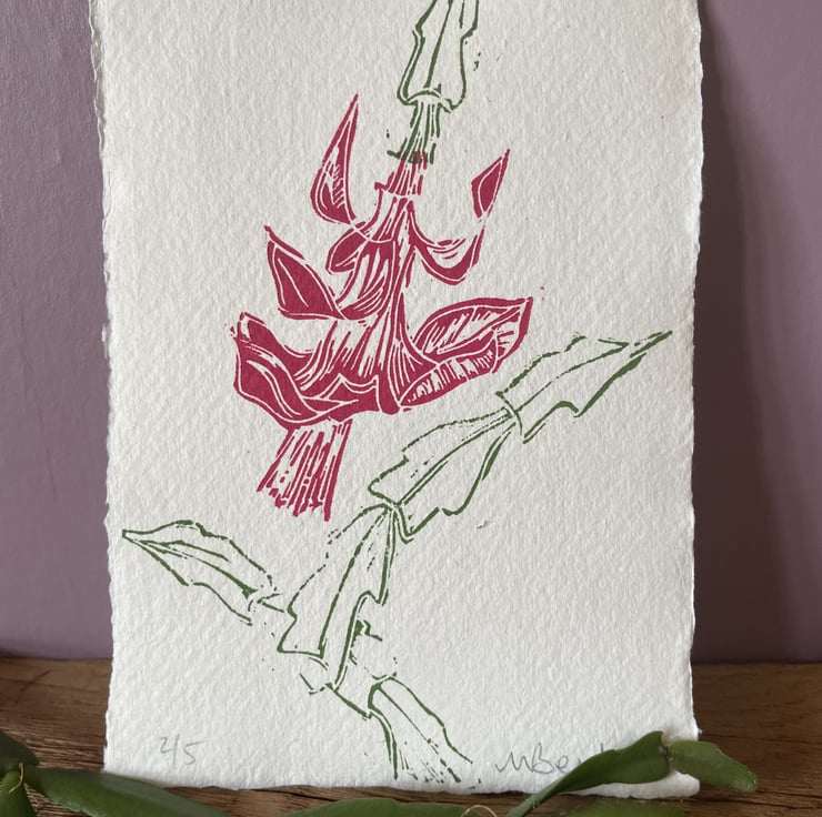 The print was made in two steps, with both flower and leaves carved from a traditional hessian backed lino. The flower was printed in a rich pink oil-based ink and the leaves printed separately using a dark green ink pad.
