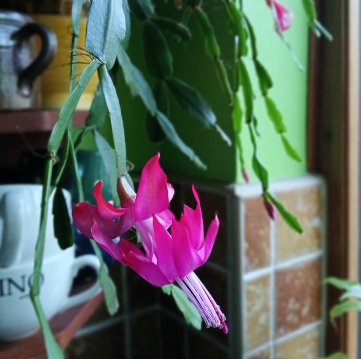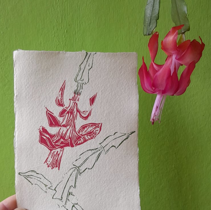 This little print was inspired by my grandma’s Christmas Cactus and particularly by the contrast of its stunning pink flowers against the lime green of my kitchen wall.