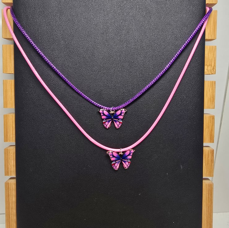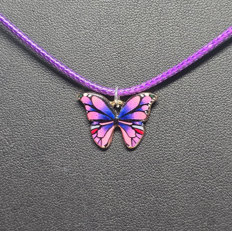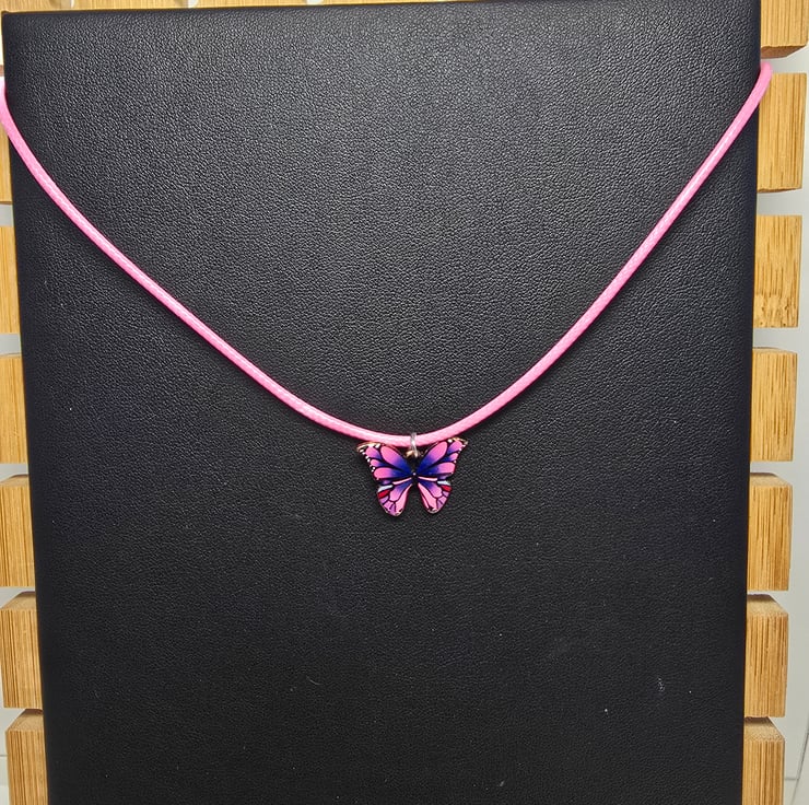 The necklace is made from a wax cord and has an pink and purple Enamel butterfly charm in the centre of the necklace.