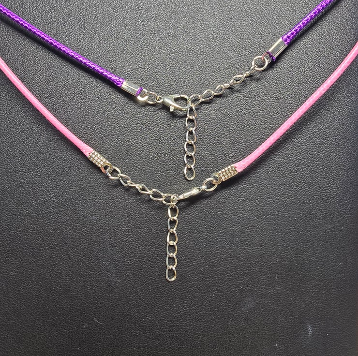The necklace is available on either a pink or purple cord, please select the option you would like. The necklace fastens at the back on a silver clasp and is adjustable in length.