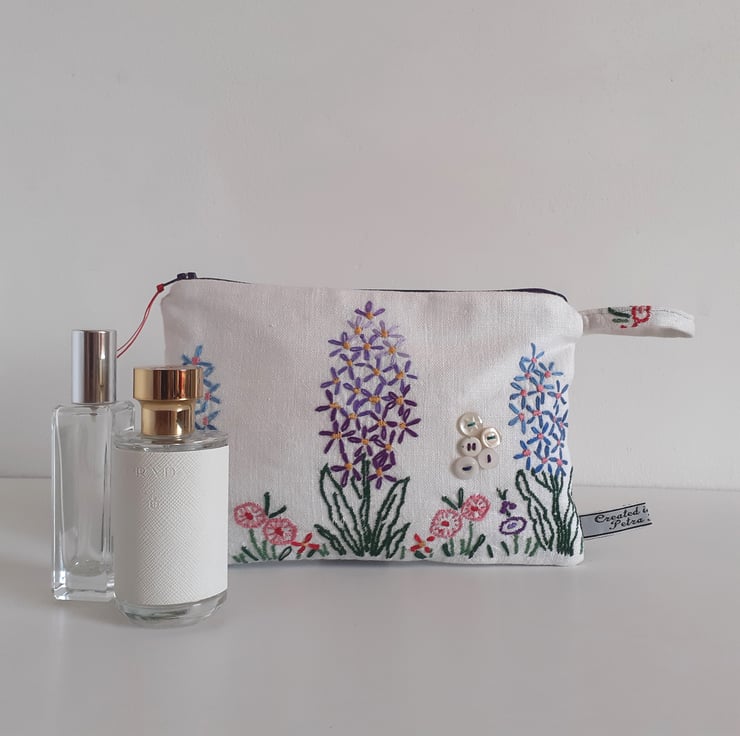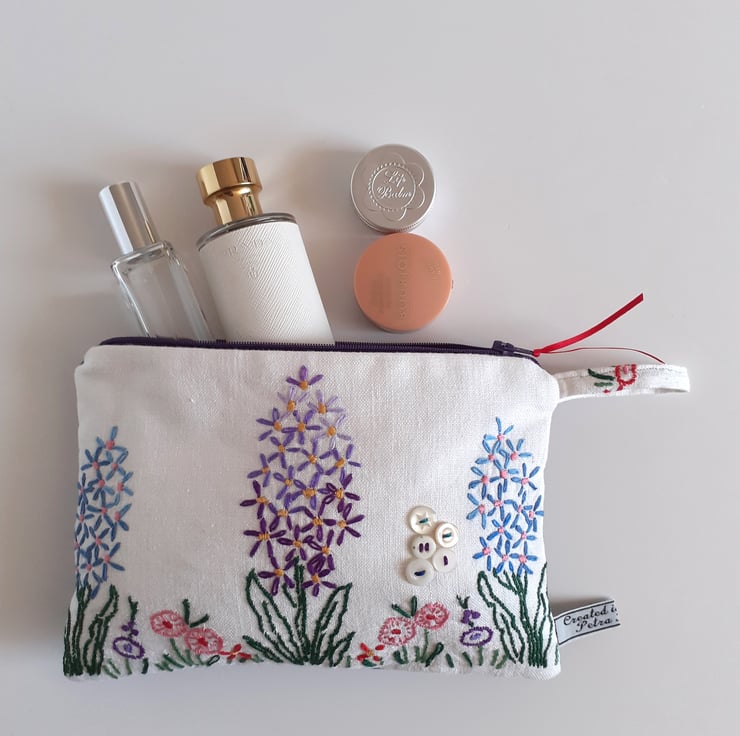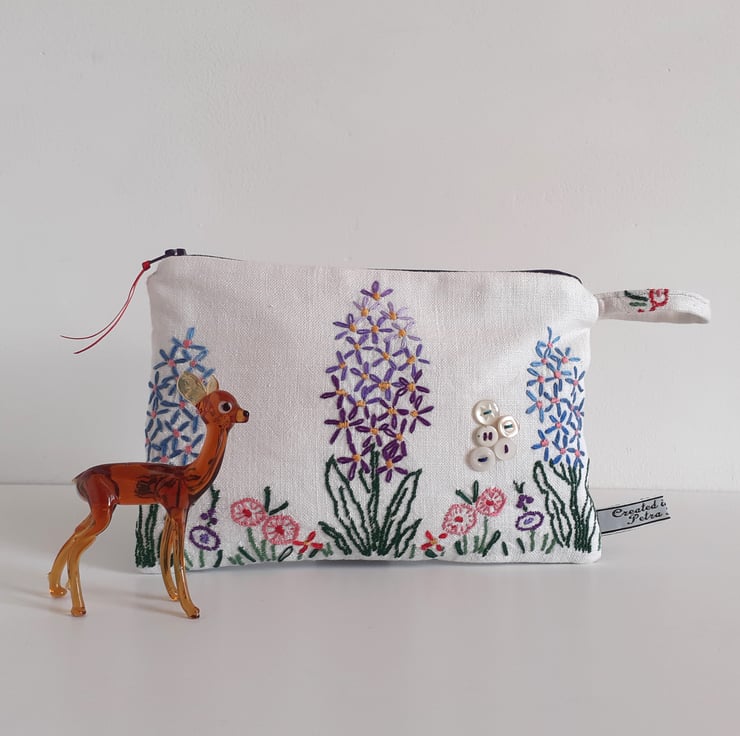 A little make up bag or zipped purse upcycled from a vintage embroidered traycloth. This vintage tray cloth had seen better days, but had the sweetest floral embroidery on each end. One end in an orange way, and this purple and lilac one on the other end!