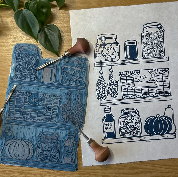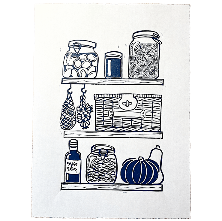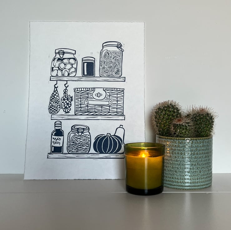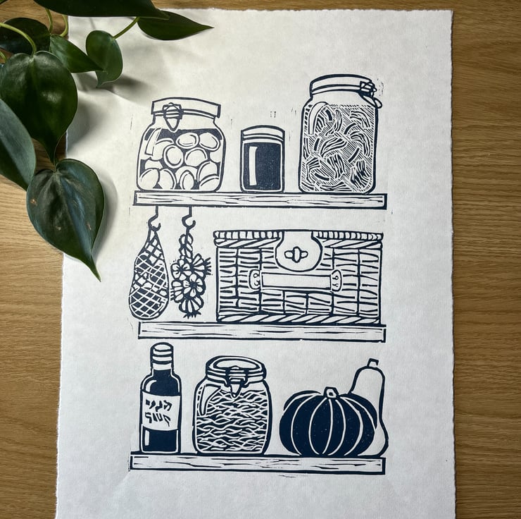Perfect for your kitchen, this hand-printed linocut was inspired by my own pantry cupboard at home. It's full of jars of kimchi and sauerkraut to squashes and the odd bottle of wine. I also keep my little picnic basket in there.