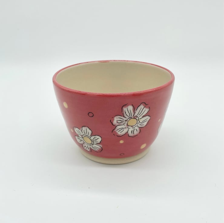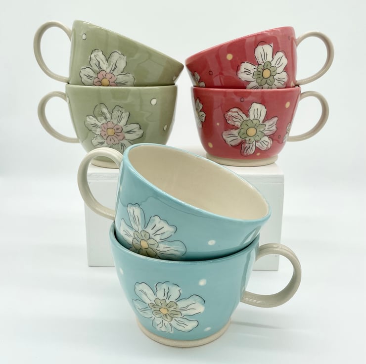 Taking inspiration from nature & my love of patterns, I’ve painted the mug body with red slip (liquid clay) then monoprinted the white flowers over. Monoprinting onto the mug gives a lovely, unique variation of print & colour to each flower. I then carved thin lines with a needle to add definition & added the handle before leaving it to dry. Once dry, I infilled the lines, fired the mug, covered it in a glossy clear glaze & fired it again. A time consuming but very enjoyable process - I hope the joy I have in making comes across in each finished piece.