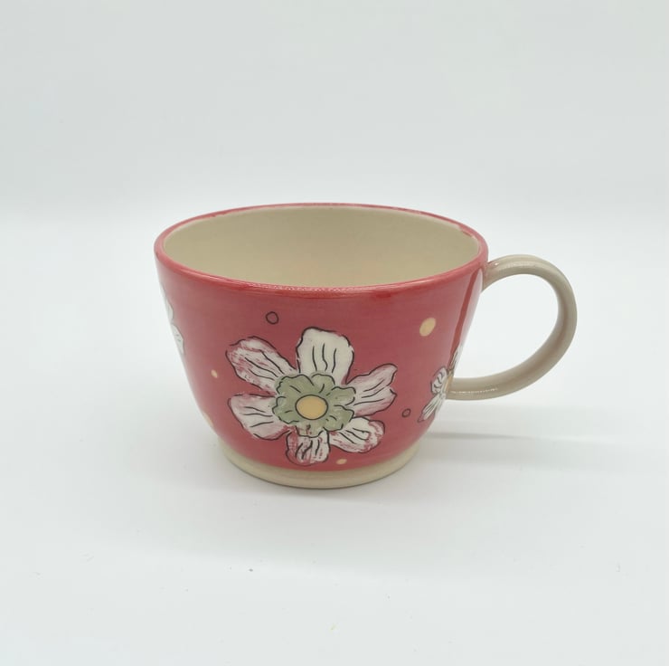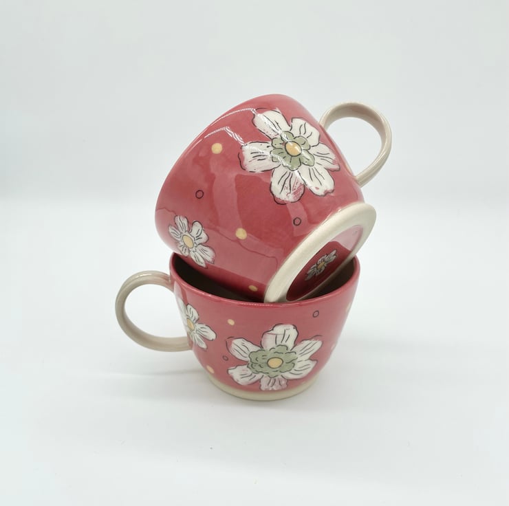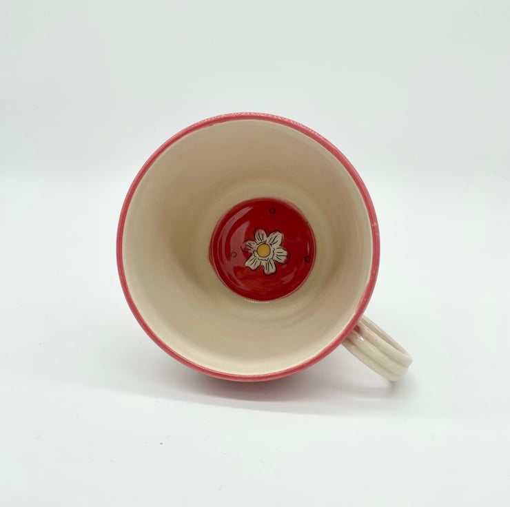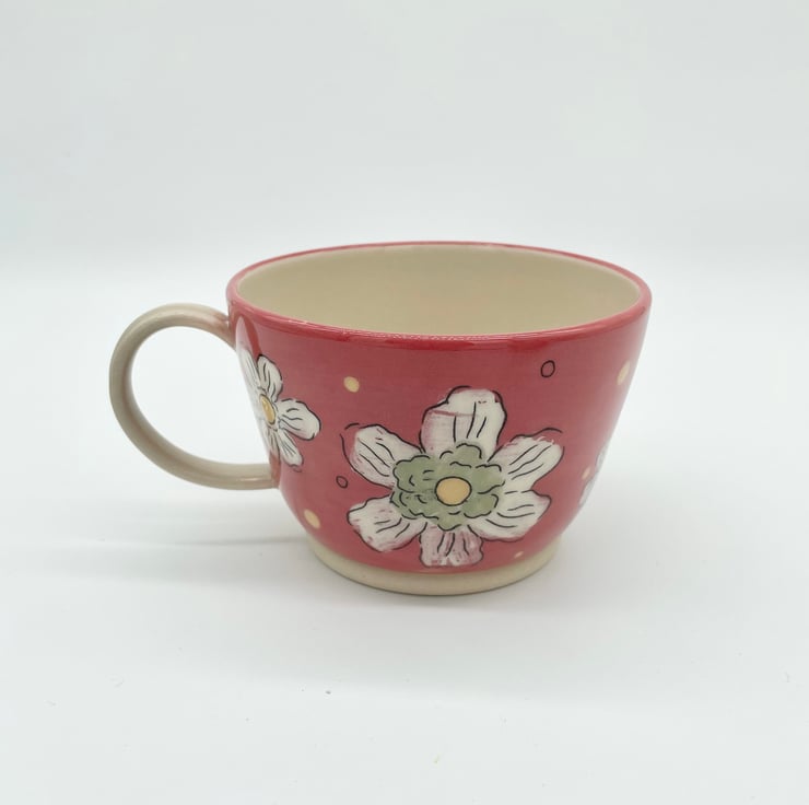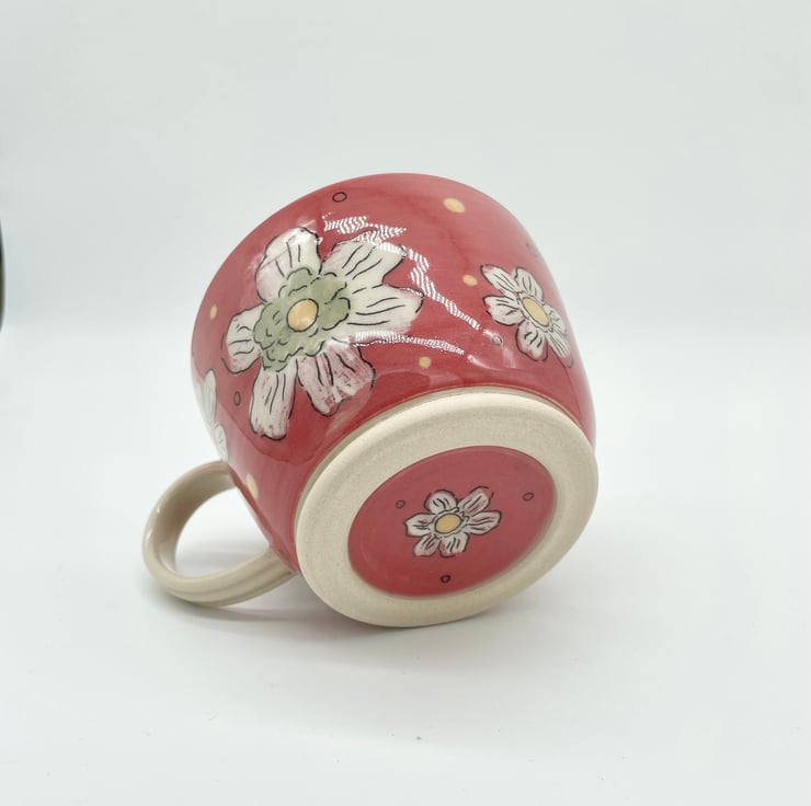 Thrown on my wheel, this springtime stoneware mug incorporates abstract white and green flowers over a pretty soft red colour (more tomato than postbox red).
