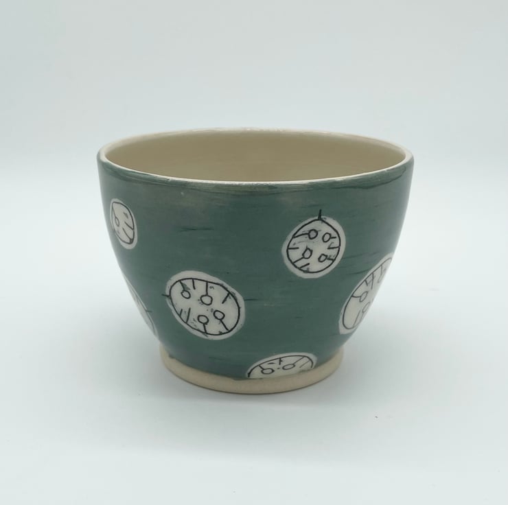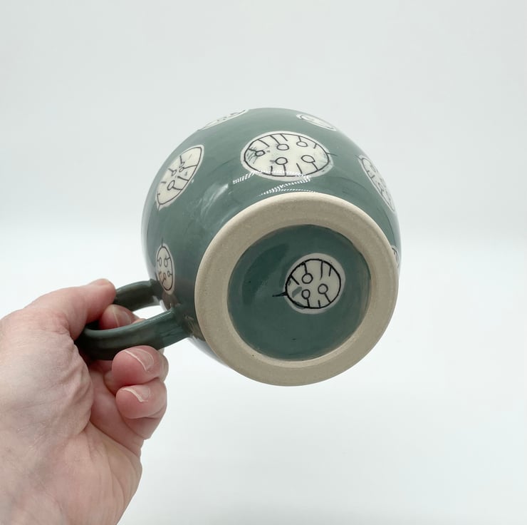 Taking inspiration from nature & my love of patterns, I’ve painted the mug body with the coloured slip (liquid clay) then monoprinted the white areas over. Monoprinting onto the mug gives a lovely, unique variation of print & colour to each seed-head. I then carved thin lines with a needle to draw the Honesty & added the handle before leaving it to dry. Once dry, I infilled the lines, fired the mug, covered it in a glossy clear glaze & fired it again. A time consuming but very enjoyable process - I hope the joy I have in making comes across in each finished piece.