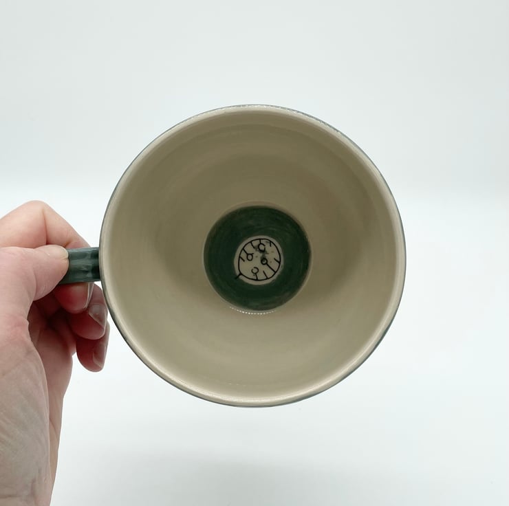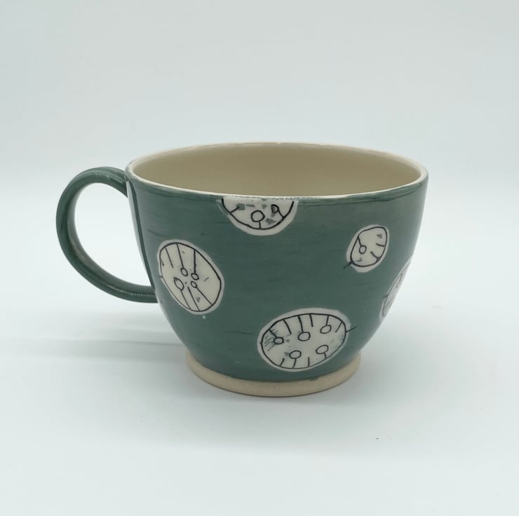 Thrown on my wheel, this stoneware mug incorporates abstract white Honesty seed heads over a pretty soft pine green / teal colour.