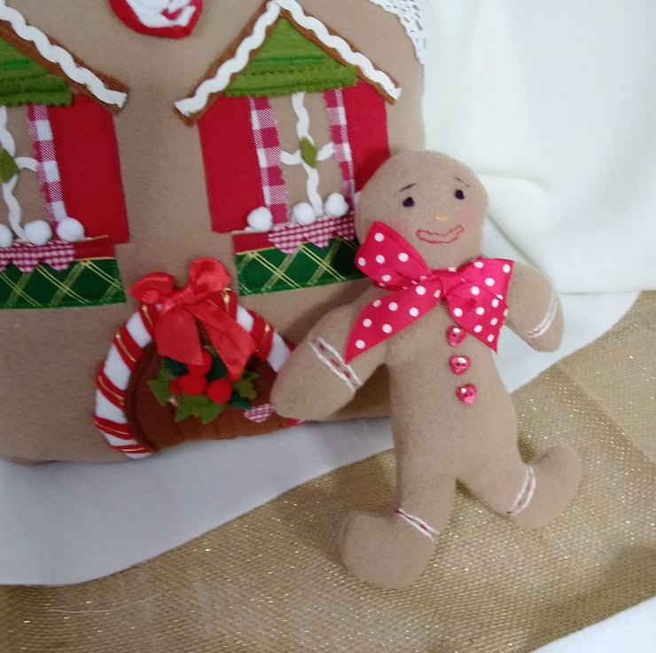 A cute soft squishy gingerbread man looks great sitting with the gingerbread house cushion.
