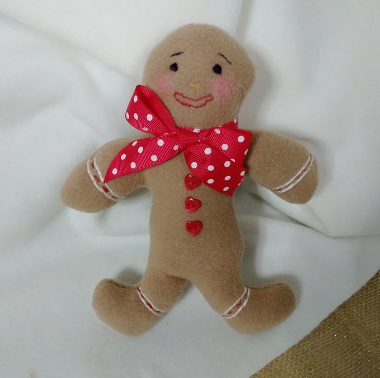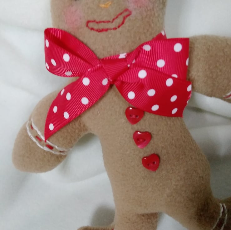 HANDMADE using fleece, toy stuffing, embroidery thread and cutesy red heart shaped buttons. He has little pink cheeks painted on with blusher, and hand embroidered features to bring him to life.