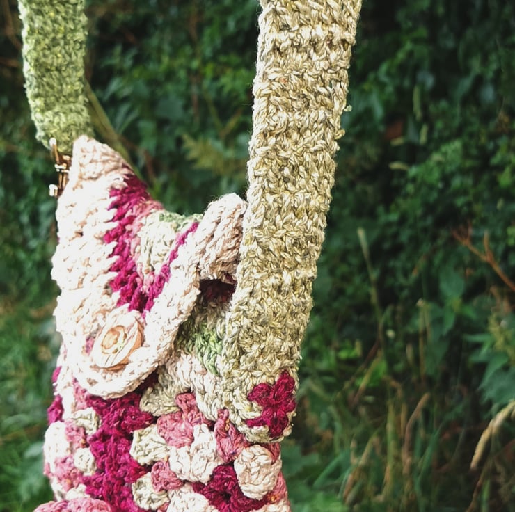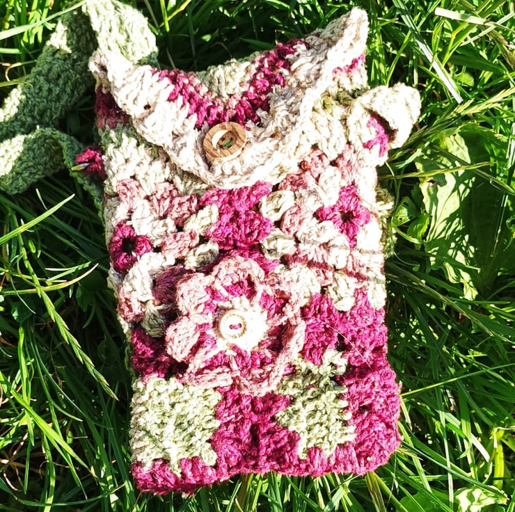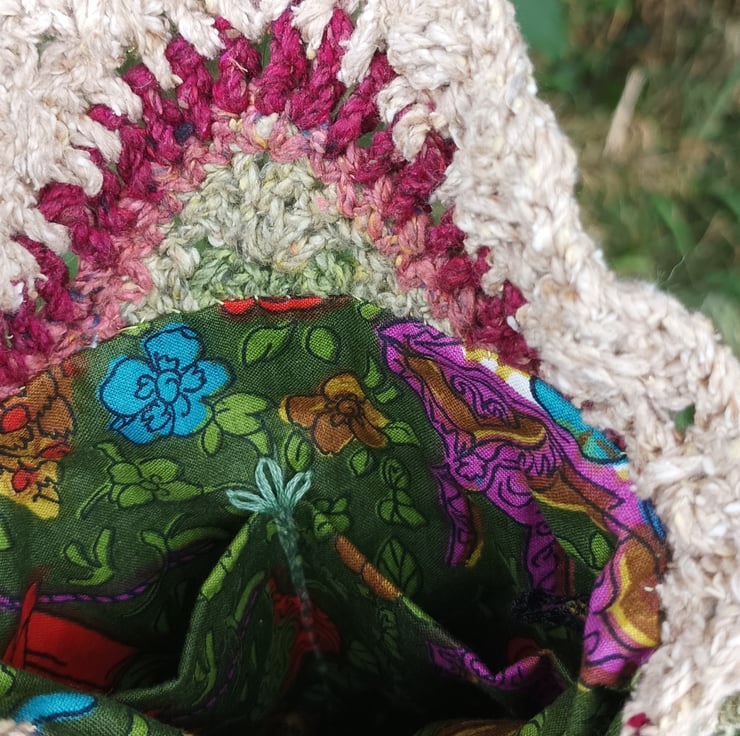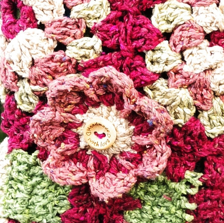Hand crochet granny square small bag in raw silk. Fully lined in cotton fabric with a small pocket for credit card. It features a poppy style flower on the front. Ideal for you phone and a few smaller items. Great for walks, holidays or festival.