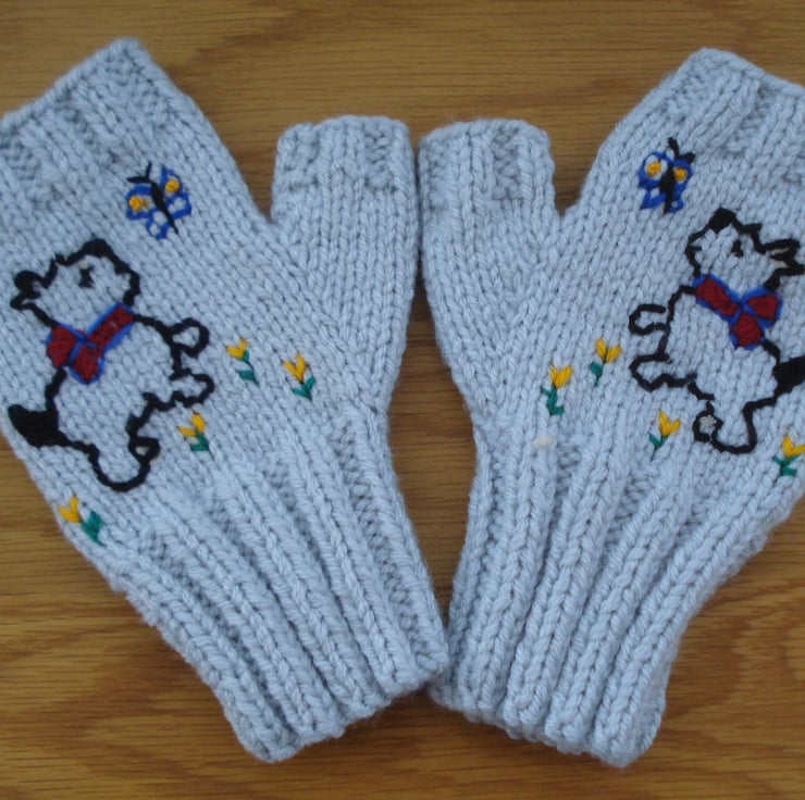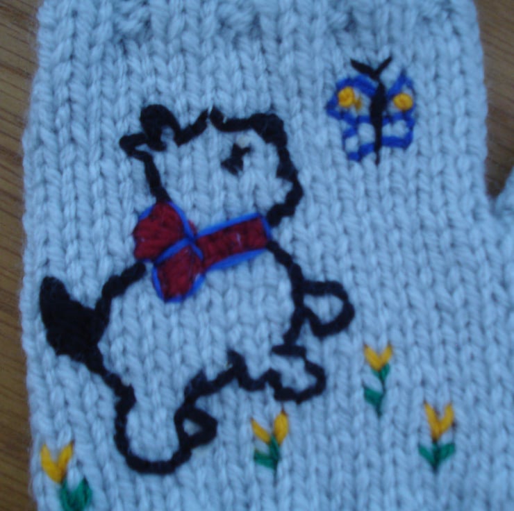 This is a pair of hand knitted pale grey gloves with a cute little embroidered black dog chasing a butterfly, the dog has a pretty red ribbon around it's neck and is standing on some yellow flowers.