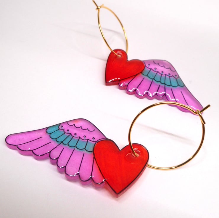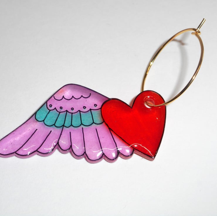 These cute Flutter Heart dangle earrings are handmade using shrinkable plastic and clear resin.