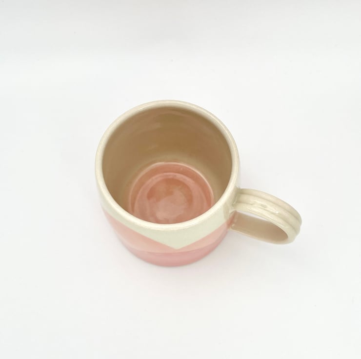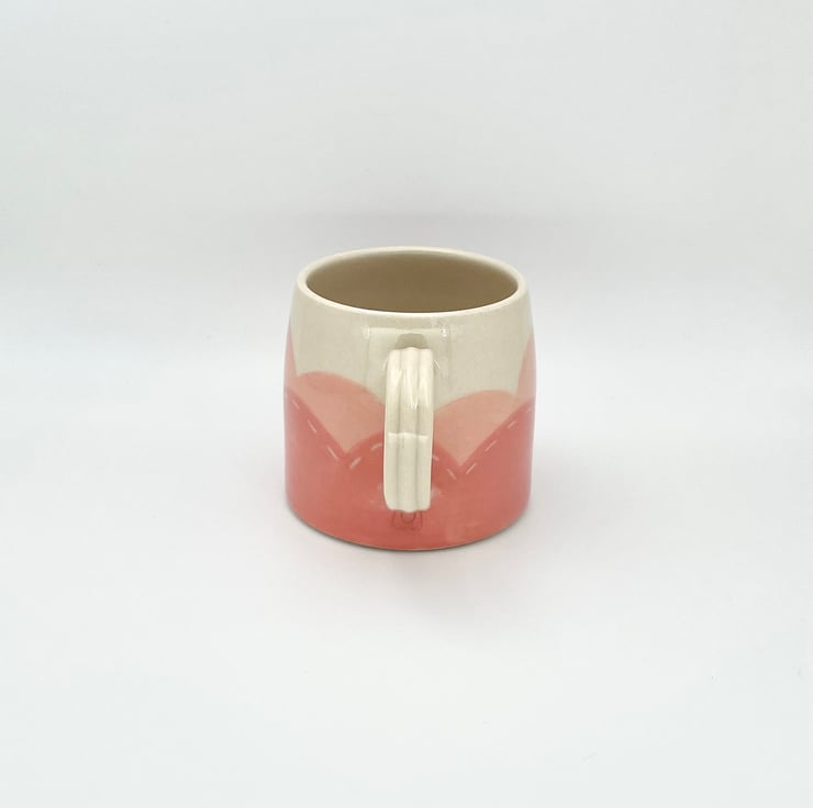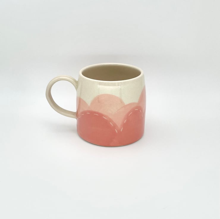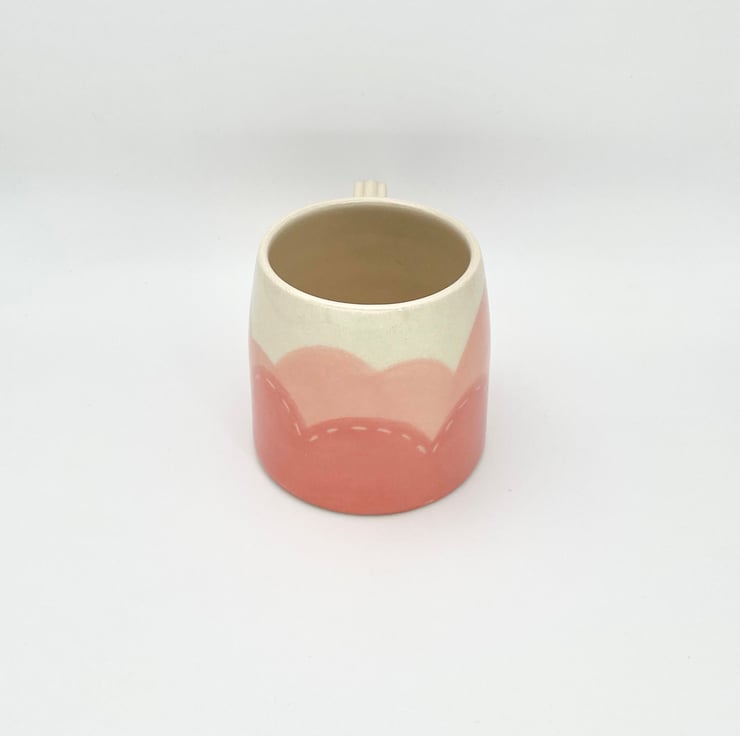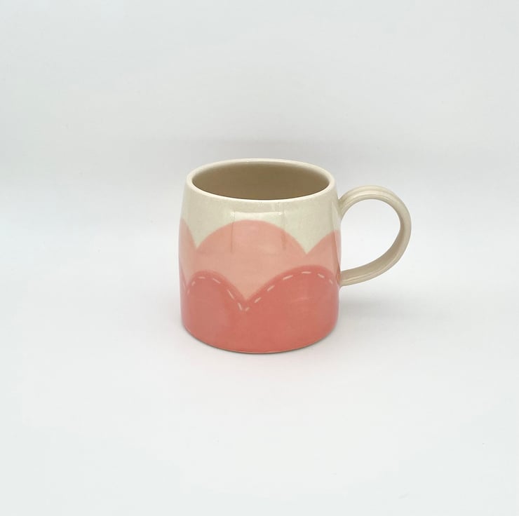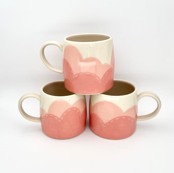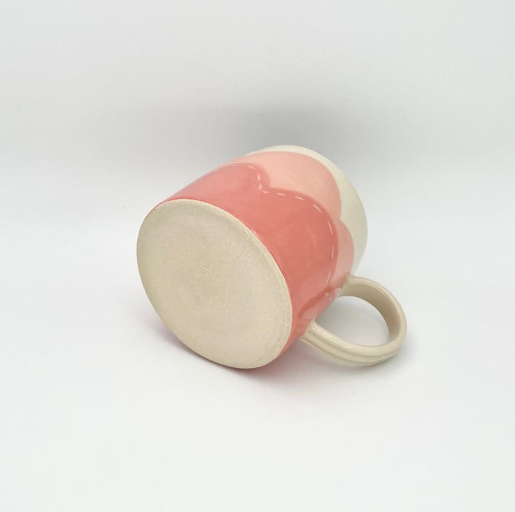 Thrown on my wheel, this pretty stoneware mug incorporates cloud like shapes in pink tones.