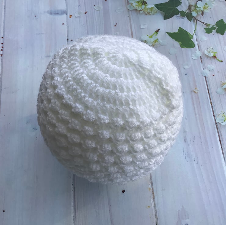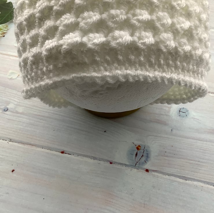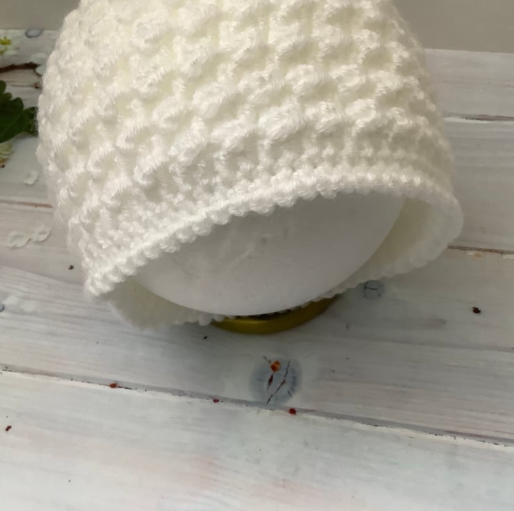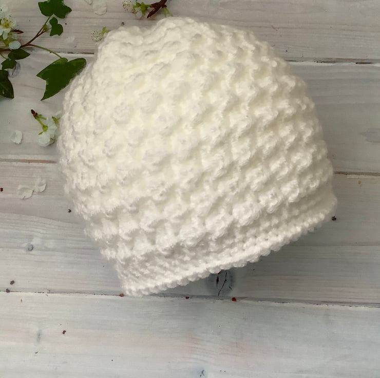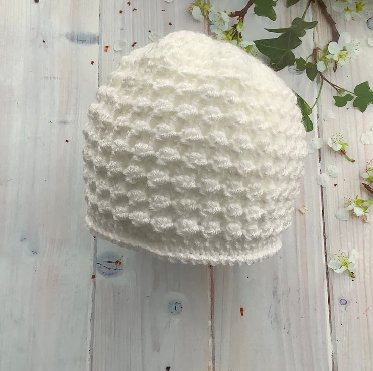I have crocheted this cute baby hat using a white acrylic yarn called Bambino which is machine washable in a warm 30degC wash, cool tumble dry, cool iron.