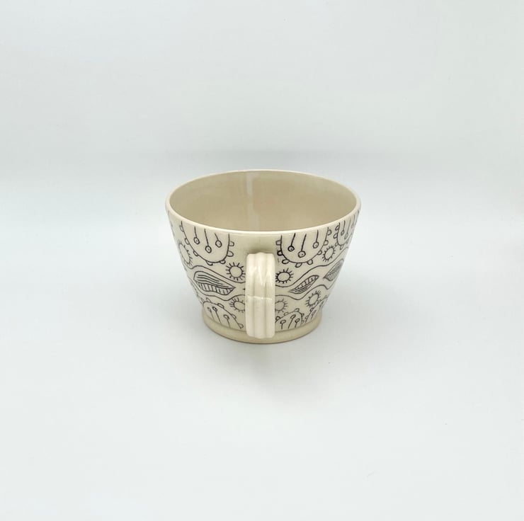 To decorate, I’ve etched the design into the body of the mug, then filled the lines with dark underglaze and painted the handle black. Drawn freehand for an informal look, the botanical pattern is inspired by petals, leaves and sead-heads & is continued on the inside bottom and outside bottom of the mug too. Each item I make has my potters mark.