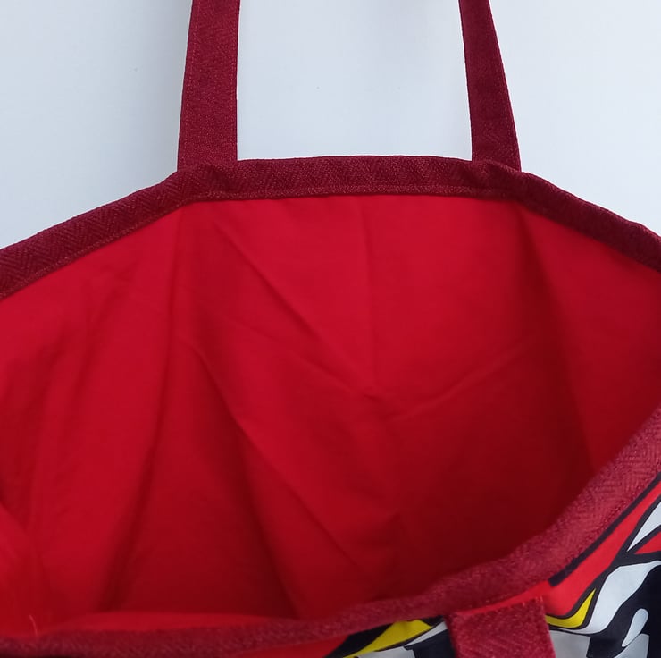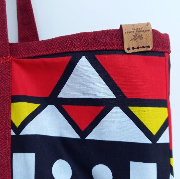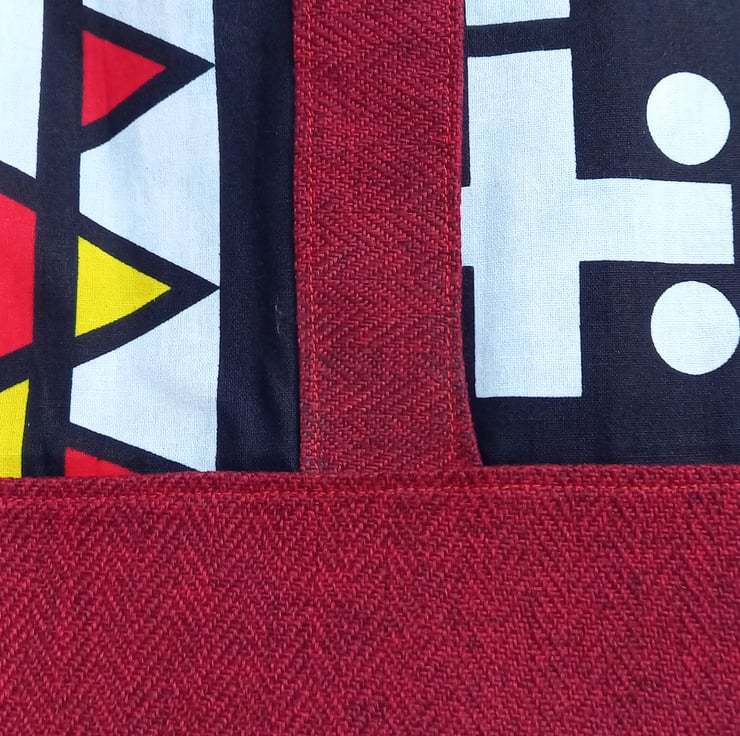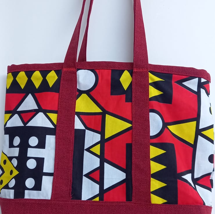 Made from African fabric and herringbone tweed. The perfect bag for the beach or the gym or as a stylish shopping bag. Fully lined. No pockets. Approx. 18inches x 14 inches.