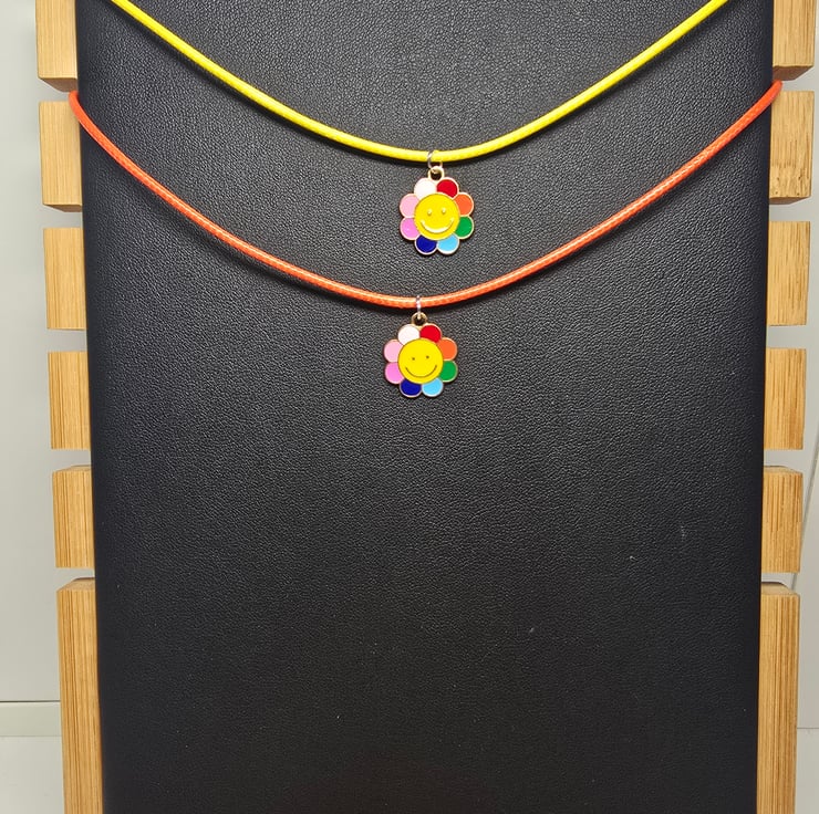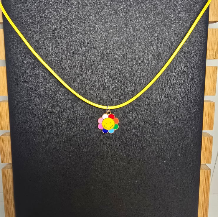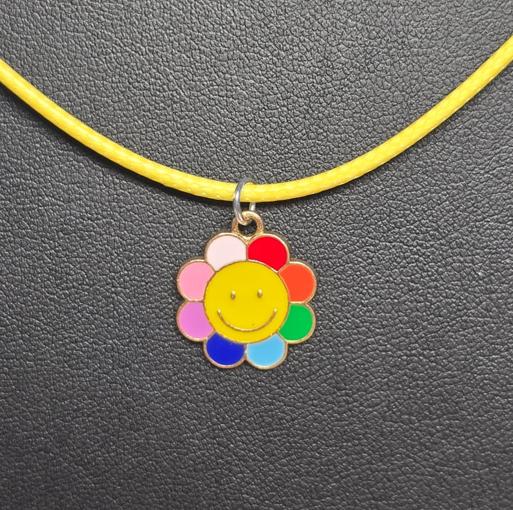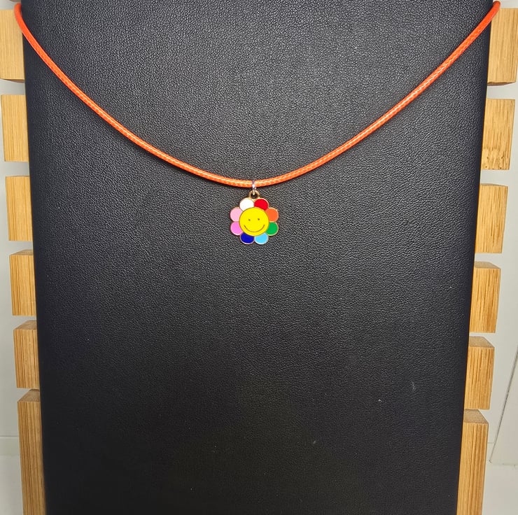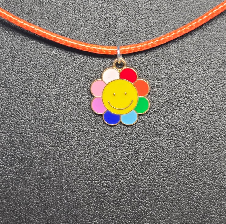 The necklace has been made with a coloured wax cord with an enamel smiling face multi coloured flower metal charm attached in the centre.