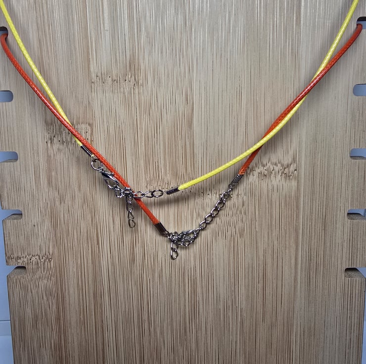 The necklace is available on either a yellow or orange cord, please select the colour that you would like. The necklace fastens at the back with a silver metal clasp and is adjustable in length.