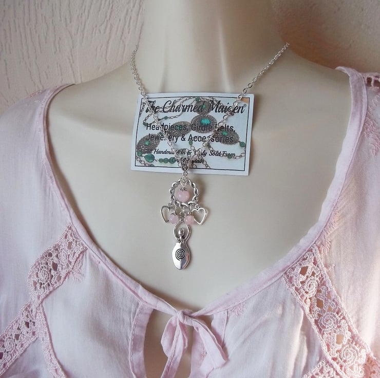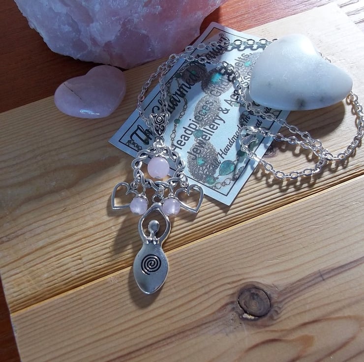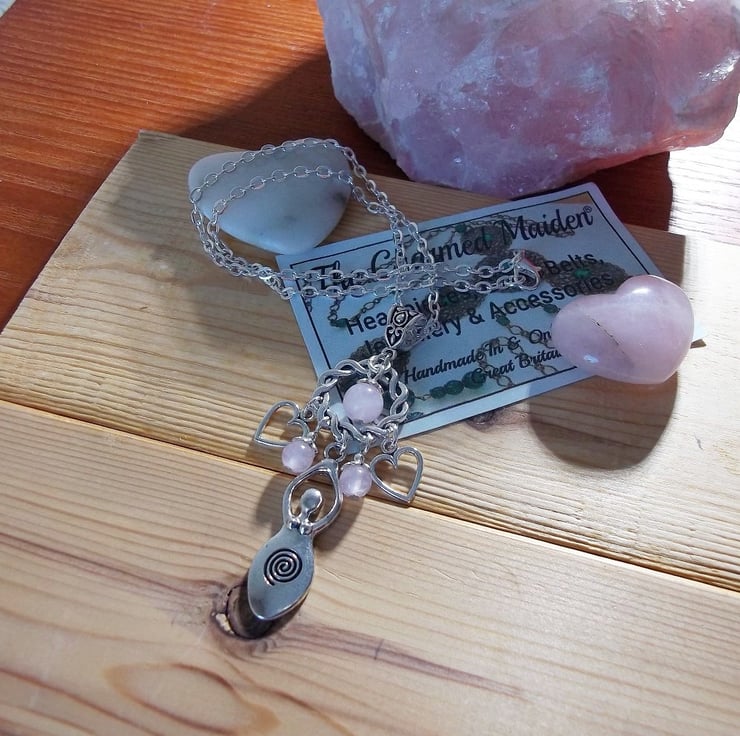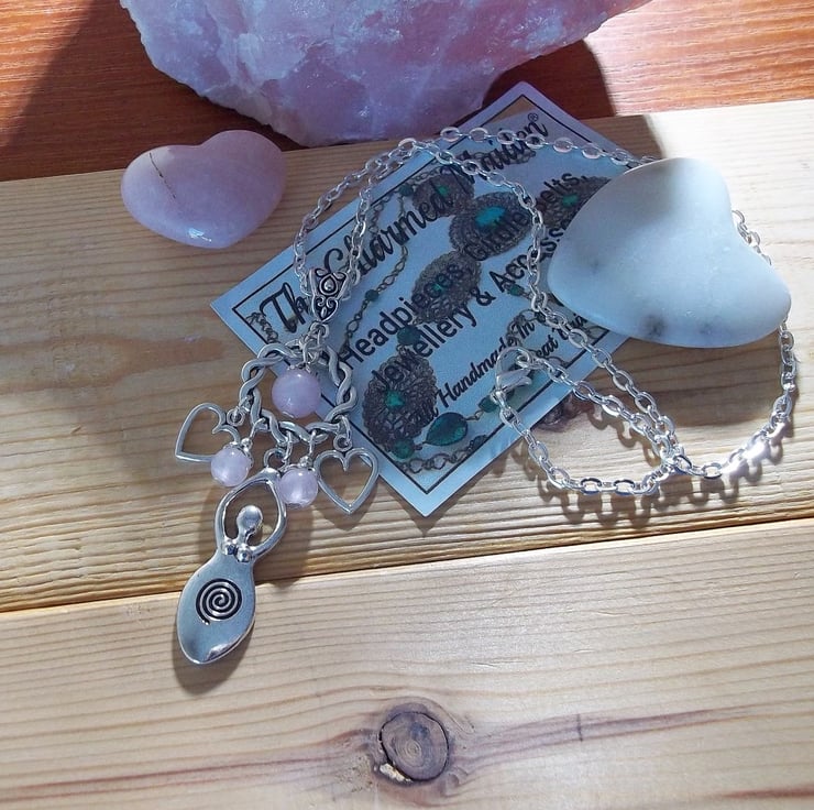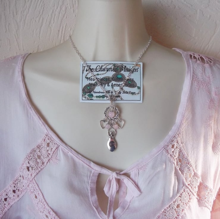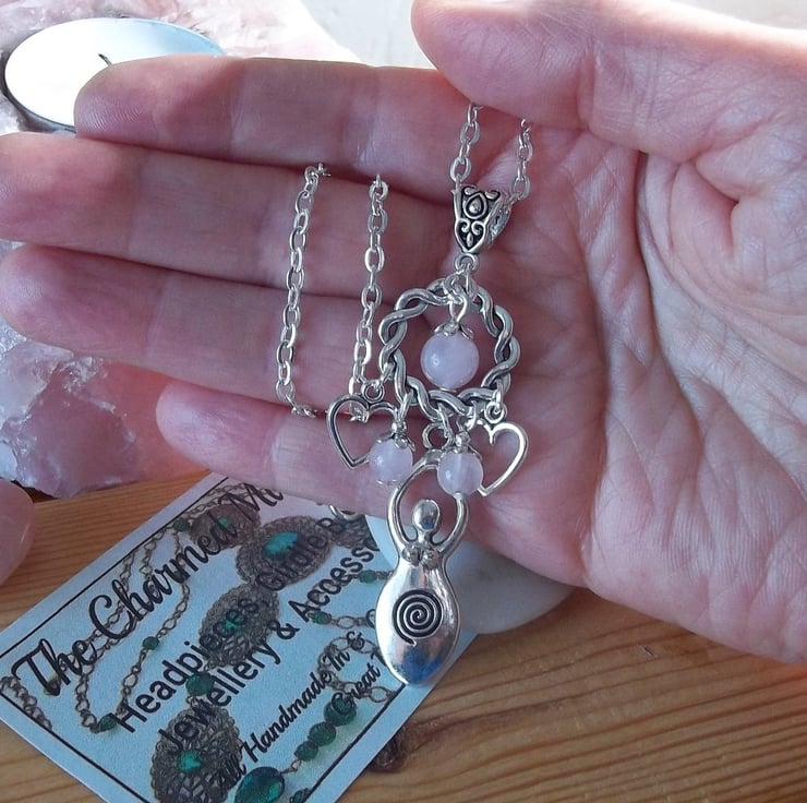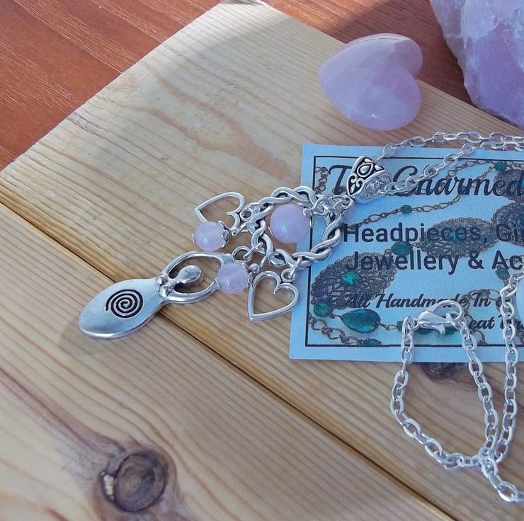 Handmade Rose Quartz, love heart, goddess & Celtic eternal wreath knot pendant necklace. The pendant is suspended from an ornate heart decorated bail which is then threaded onto a silver plated chain.