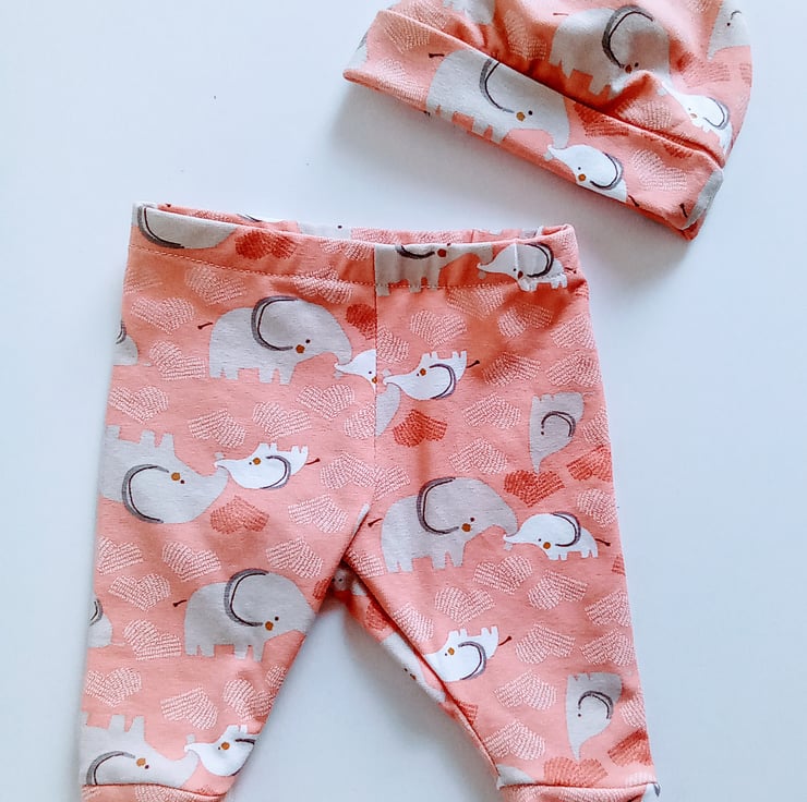 Leggings and hat set in a cute elephant design jersey fabric, suitable for a newborn gift.