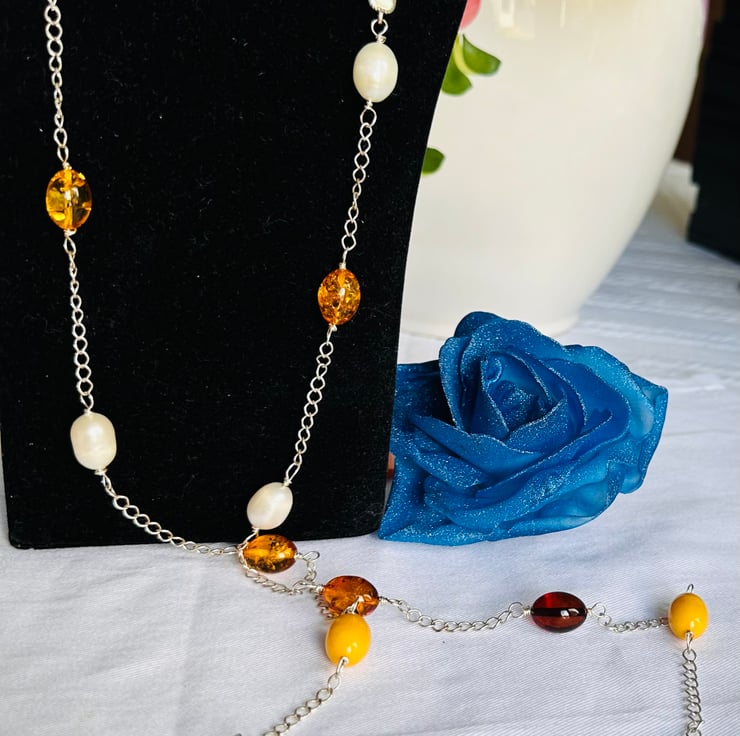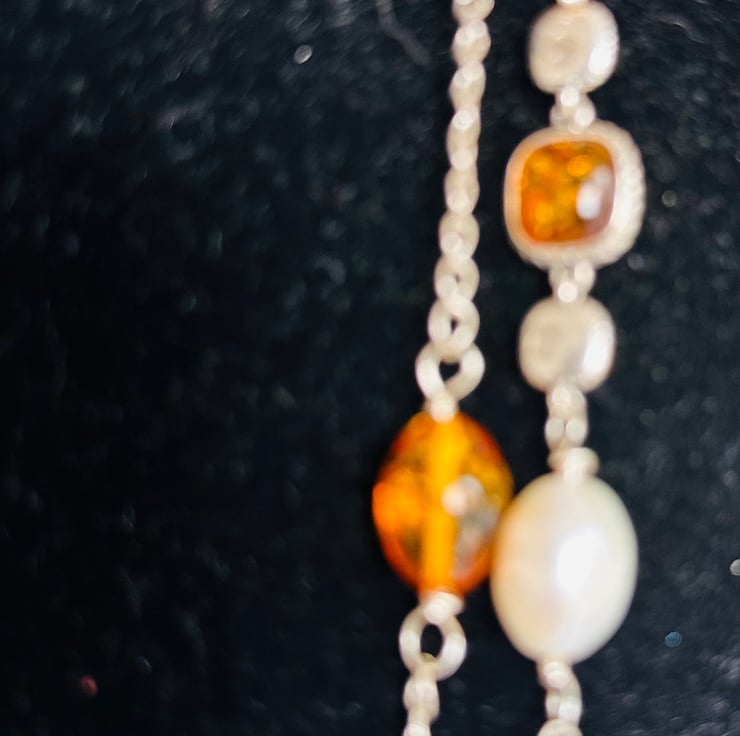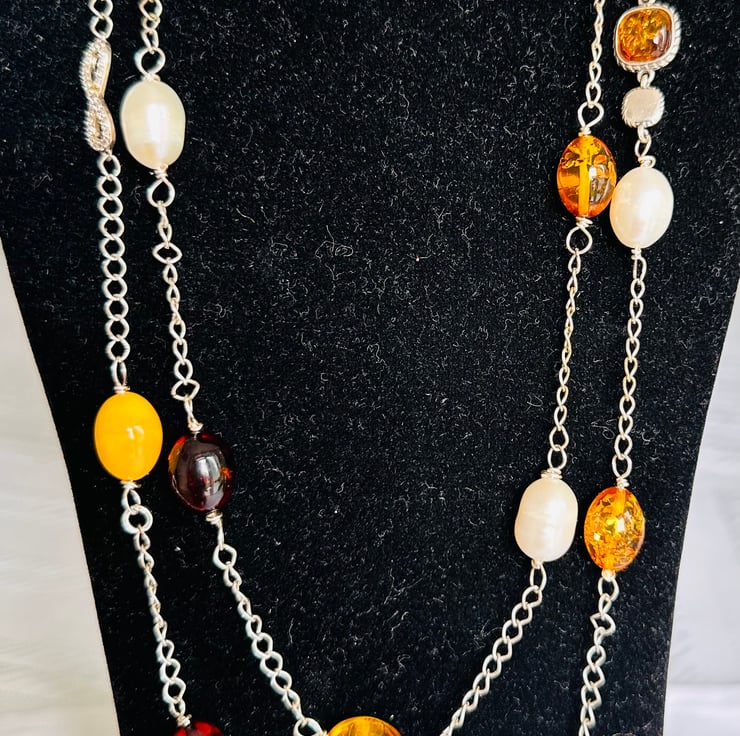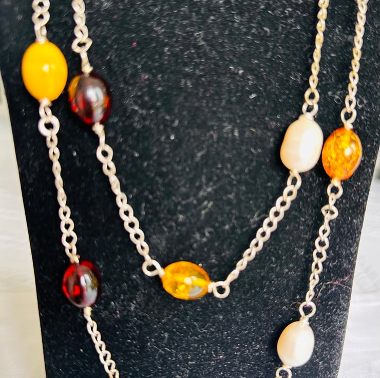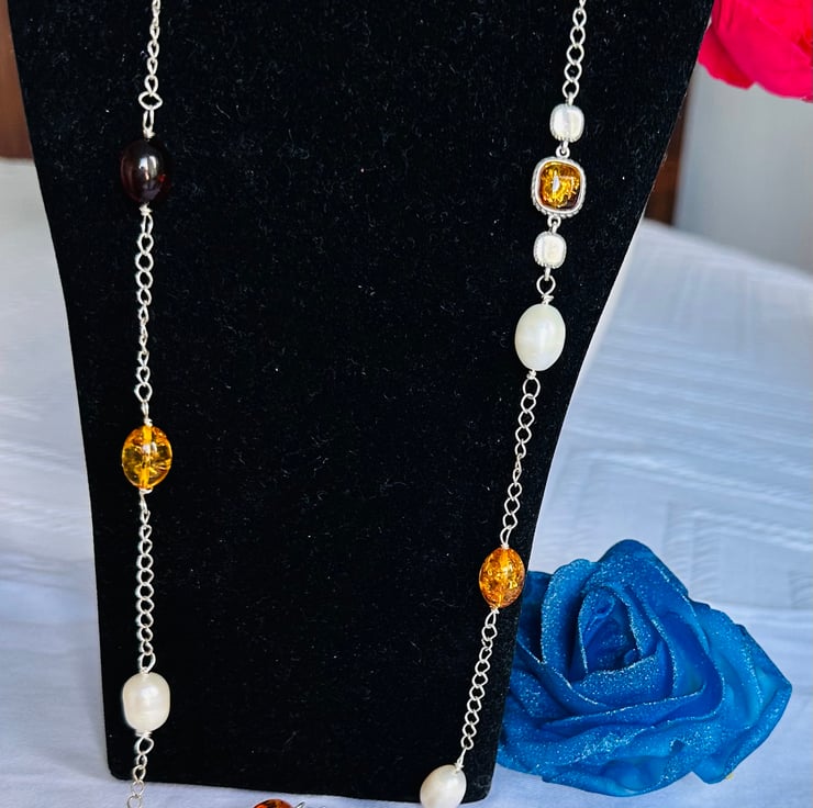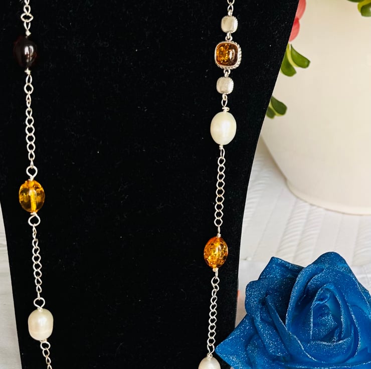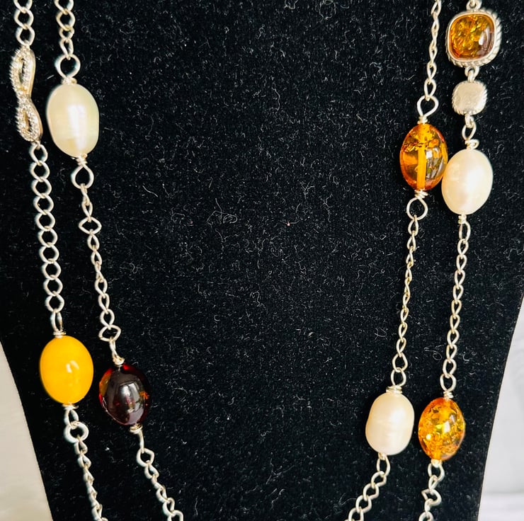 Very long necklace freshwater/cultured pearl and amber necklace, inspired by Chanel necklace, can be worn long or double up.